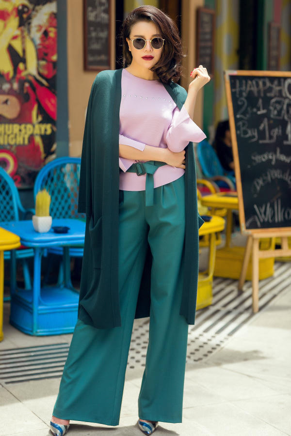 Quần lụa ống rộng được cô nhấn nhá bằng thắt lưng cùng tông để không bị "nuốt" dáng.