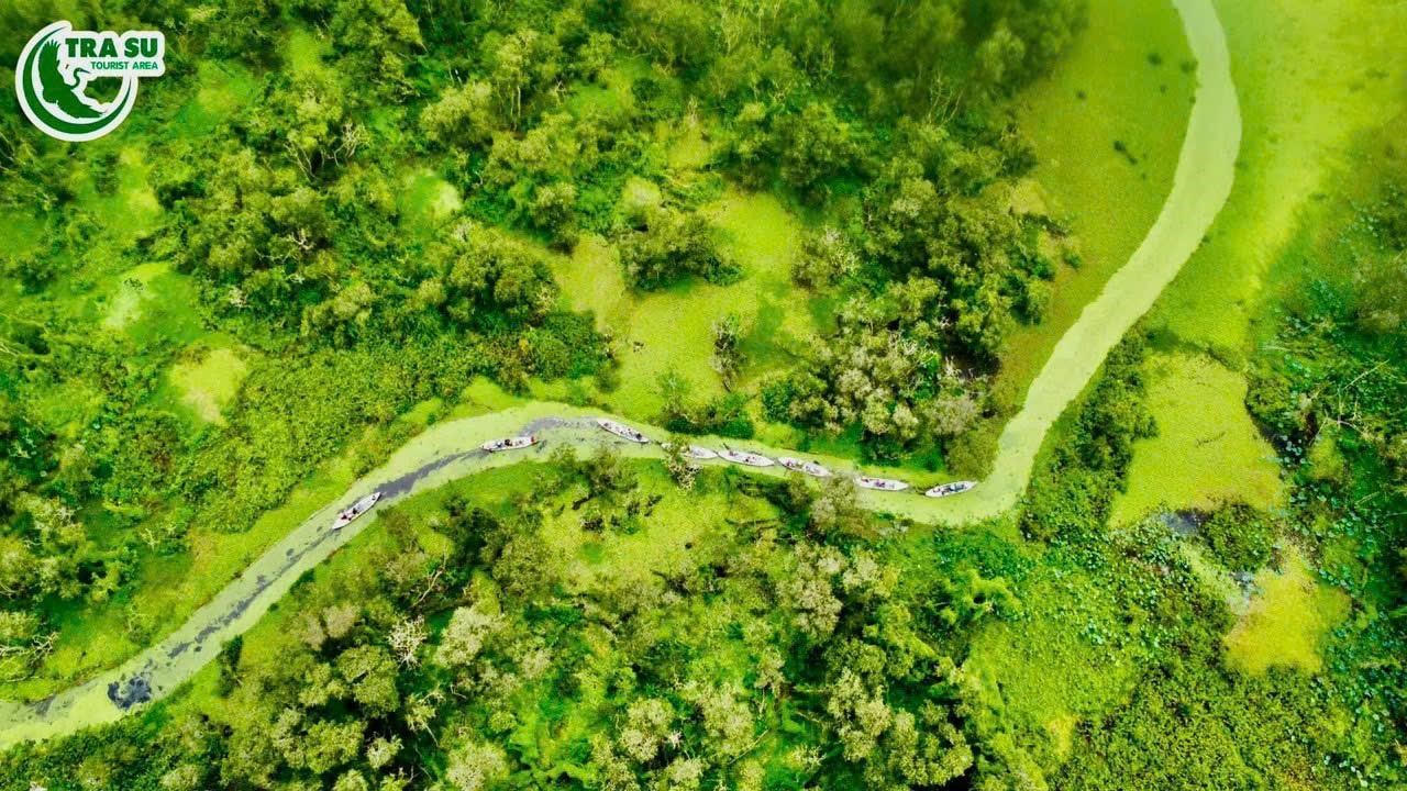 Chiếc xuồng chầm chậm đẩy đưa xuôi theo dòng ra hồ sen rộng lớn, hai bên thủy trình, lớp lớp tràm phủ kín, chi chít tổ chim - cò, có con thì đang ăn, có con thì ngủ, có con thì phất cao đôi cánh bay lượn khắp vùng. Hàng triệu triệu thân tràm vươn mình sức trẻ, chen nhau đón nắng, hứng mưa. Thế mới nói thiên nhiên Trà Sư luôn rộng lớn bao phần và dường như luôn sự kế tục kết nối để bảo tồn lãnh địa tràm.