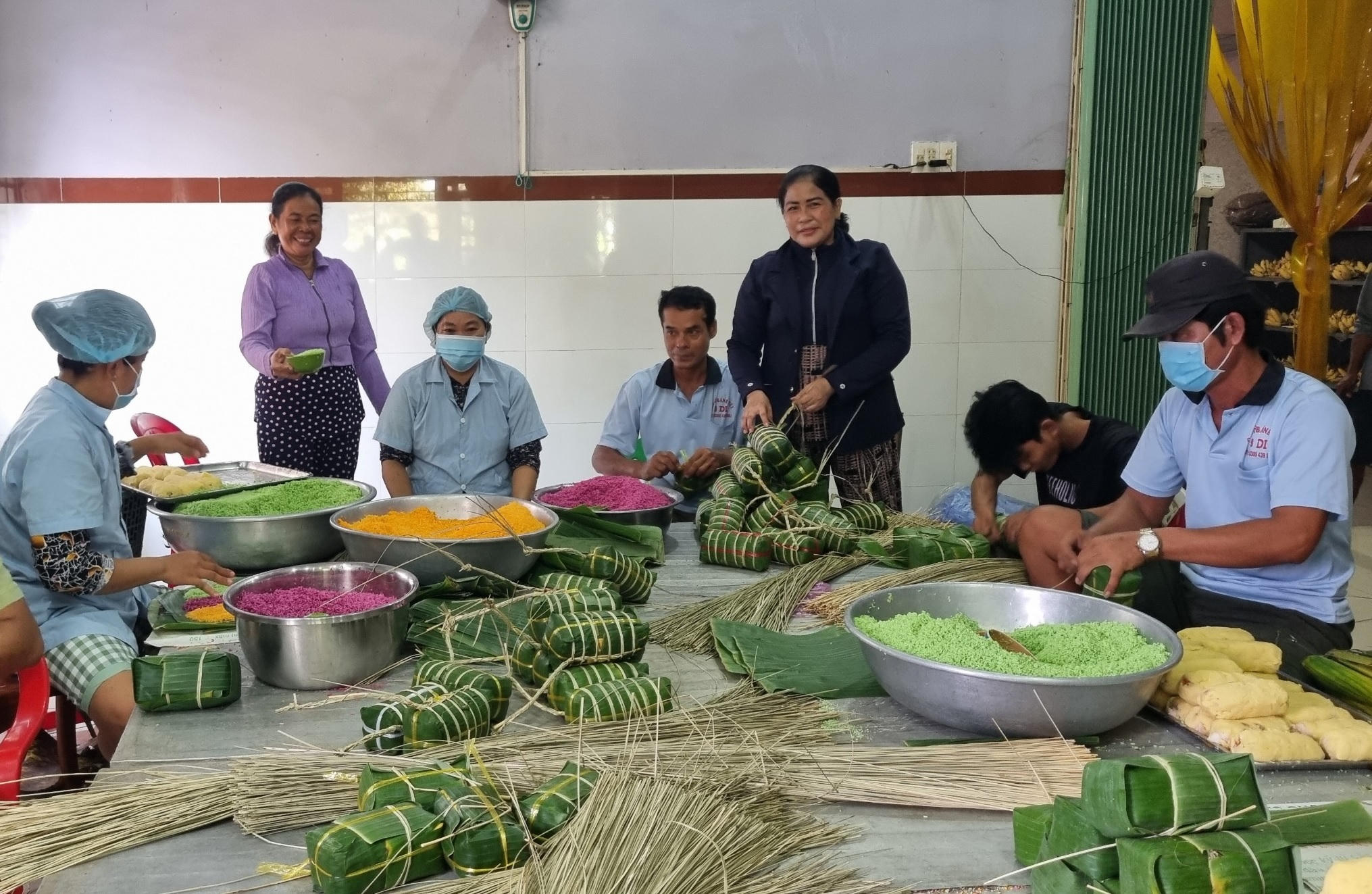 Là người có hàng chục năm thâm niên với nghề làm bánh tét, bà Mai Hoàng Lý - chủ cơ sở sản xuất bánh Hai Lý cho biết, cứ mỗi độ tháng 12 âm lịch là các bếp lò tại làng nghề nơi đây lại bắt đầu “chạy đua” với Tết. Công tác chuẩn bị nguyên liệu (lá chuối, nếp, các nguyên liệu tạo màu cho nếp như lá dứa, lá cẩm, trái gấc…) phải được dự trù từ rất sớm mới kịp đáp ứng thị trường.