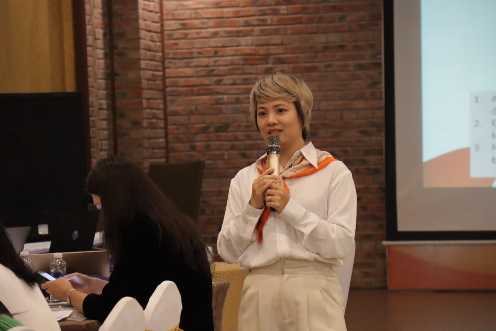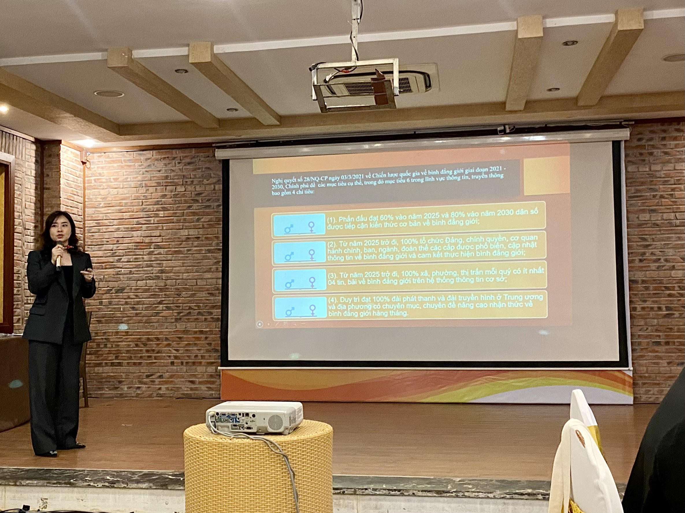 Bà Ngô Diệu Linh, Phó Vụ trưởng Vụ Bình đẳng giới, Bộ Lao động - Thương binh và Xã hội chia sẻ tại chương trình tập huấn. |