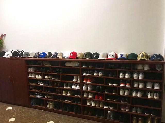 Bộ sưu tập giày và mũ số lượng lớn của Anh Vũ được bày biện một cách gọn gàng trên giá.