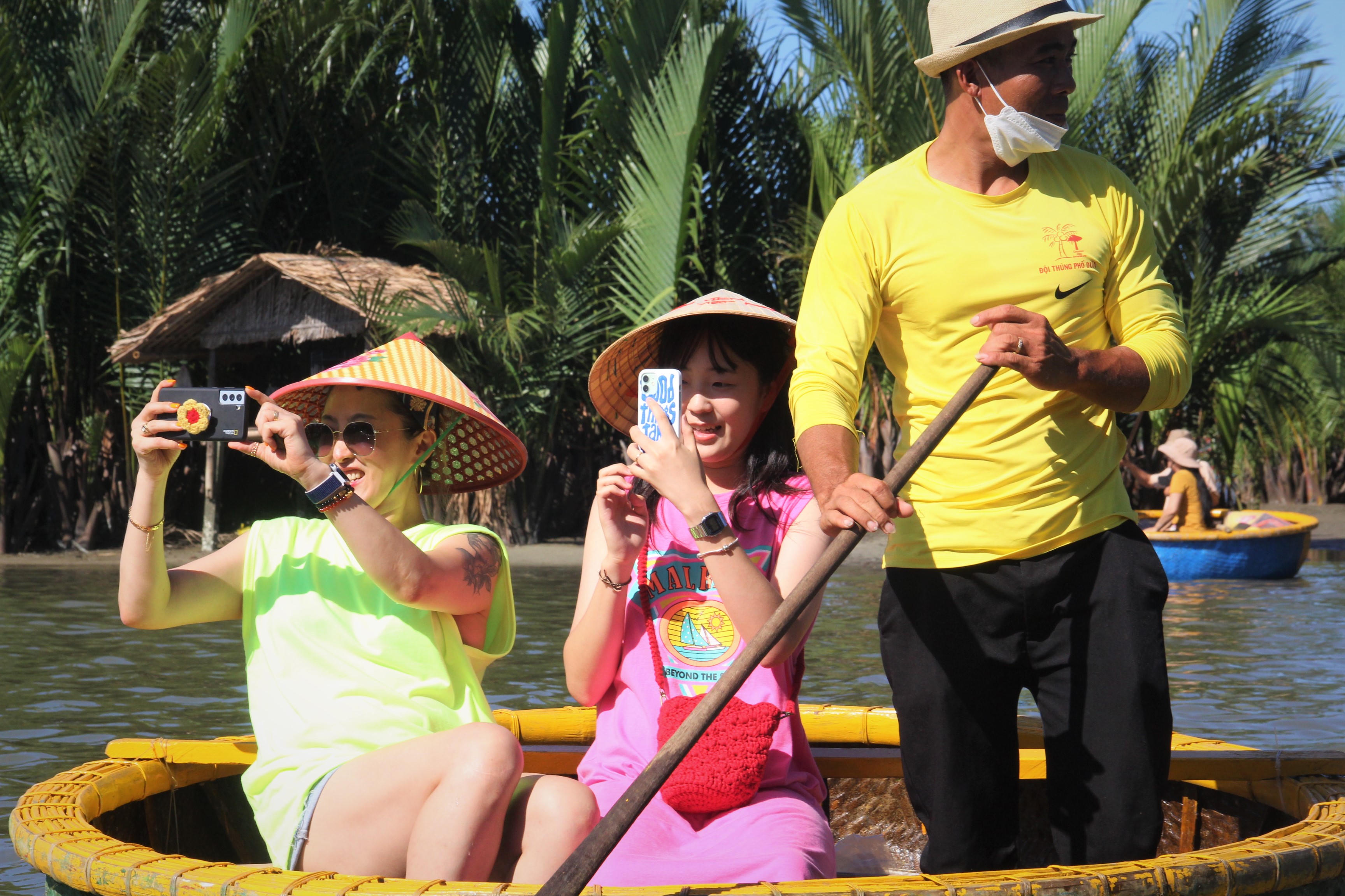 Du khách nước ngoài háo hức khi trải nghiệm ngồi thuyền thúng.
