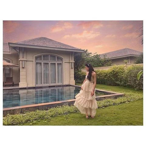 Bể bơi riêng trong sân vườn của từng villa mang lại trải nghiệm riêng tư tuyệt đối. Từ đây chỉ cần vài bước chân là có thể ra tới biển bằng lối đi riêng. Chẳng cần rong ruổi đâu xa, khung cảnh đậm chất nhiệt đới với không gian mát lành của cỏ cây, lắng nghe sóng biển dịu êm ngay bên hồ bơi trước hiên nhà là background nên thơ cho các nàng thả dáng. (Ảnh: 496__________)