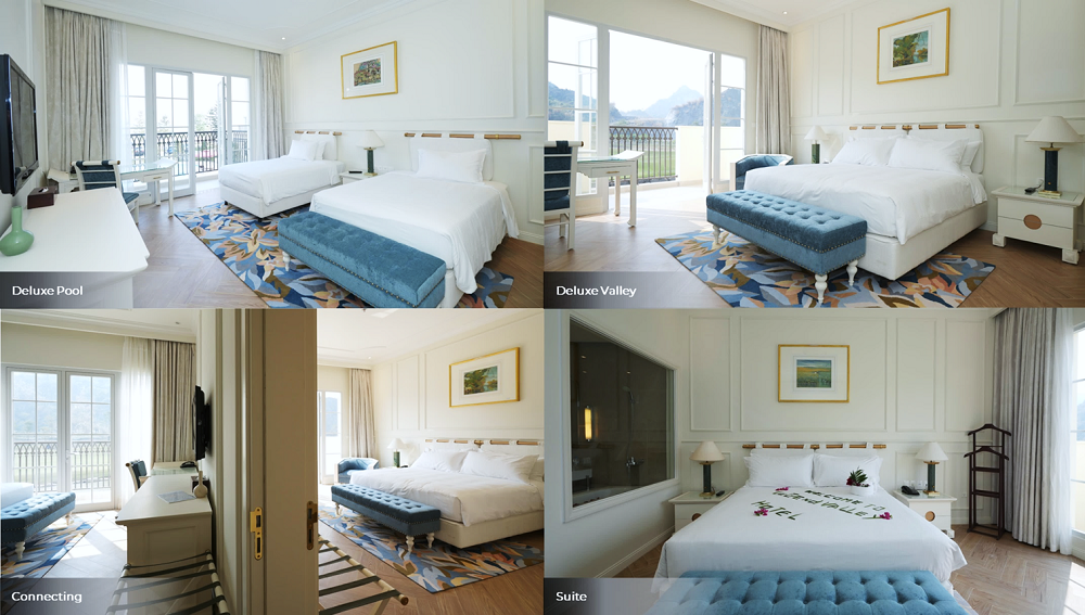 Khách sạn cung cấp hơn 200 phòng nghỉ cao cấp, được chia thành các hạng phòng với diện tích đa dạng (38-120 m2) và thiết kế tinh tế, đáp ứng nhu cầu nghỉ dưỡng đa dạng của các khách hàng, từ những người yêu gôn và yêu thiên nhiên tới những gia đình đa thế hệ và những đoàn khách du lịch lớn.