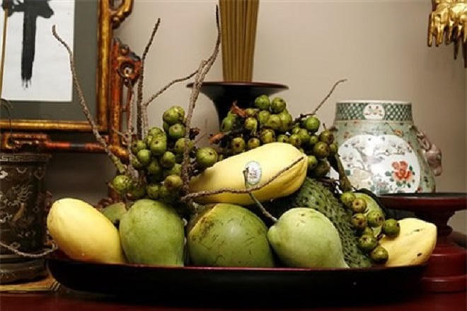 Mâm ngũ quả làm cho quang cảnh Tết và không gian thờ cúng thêm ấm áp, rực rỡ mà hài hoà với màu xanh mát của dưa hấu, đỏ rực của hồng, nâu mịn của hồng xiêm, vàng tươi của bưởi, cam, dứa… Nó thể hiện sinh động ý nghĩa triết học – tín ngưỡng – thẩm mỹ ngày Tết cùng những ước vọng lạc quan mà mỗi gia đình mang theo khi bước vào năm mới).