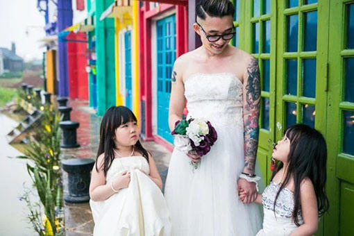 Cách đây không lâu, bộ ảnh độc lạ của anh Nguyễn Phan Thành mặc váy cưới cùng với hai cô con gái Nguyễn Phan Tuệ Minh và Nguyễn Phan Minh Anh đã khiến cộng đồng mạng vô cùng thích thú. Để kỷ niệm 2 năm “gà trống nuôi con”, anh đã không ngại mặc váy cô dâu, ghi lại những khoảnh khắc hạnh phúc bên các con.