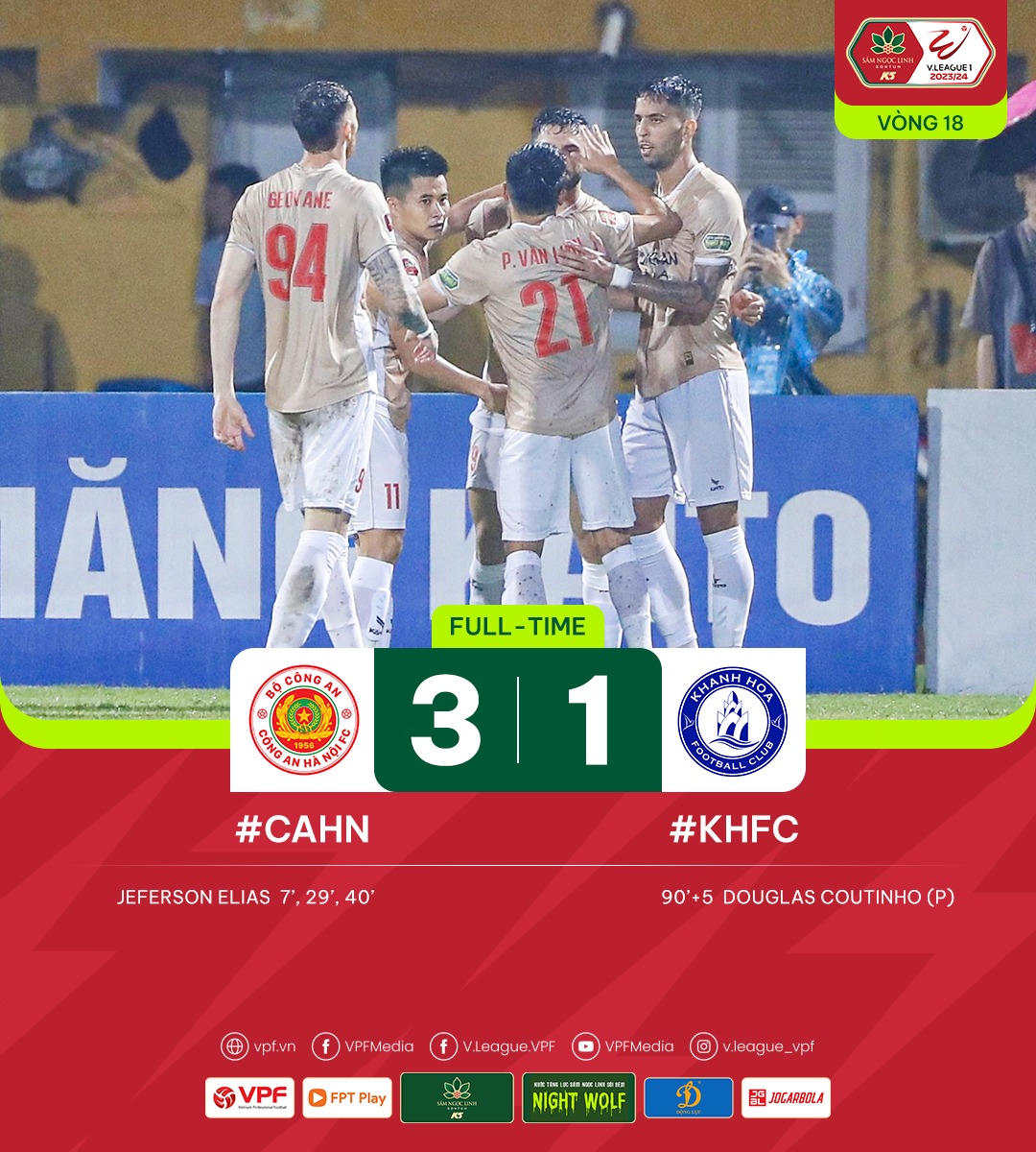 Hôm qua (12/5) Với cú hattrick ngay trong hiệp 1, Jeferson Elias giúp CLB Công An Hà Nội tìm lại hương vị chiến thắng với 3 điểm trọn vẹn trước đội bóng phố Biển Khánh Hoà.