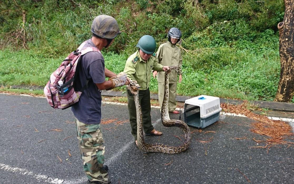 Con trăn gấm dài gần 5m, nặng trên 30kg. Hiện lực lượng chức năng đã đưa trăn về chăm sóc, khi trăn khỏe lại sẽ thả về núi Sơn Trà.