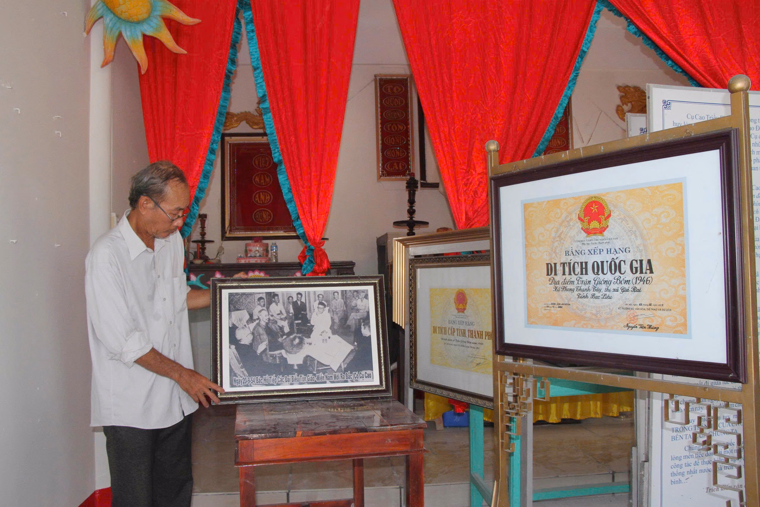 Ông Cao Việt Thắng - Trưởng Ban Quản lý khu di tích cho biết, sau Nam Bộ kháng chiến, để chuẩn bị cho cuộc chiến đấu chống thực dân Pháp tái xâm lược, Hội thánh Cao đài Minh Chơn Đạo do cụ Cao Triều Phát – Phó Chủ nhiệm Mặt trận Việt Minh tỉnh Bạc Liêu, ứng cử viên ĐBQH khóa I – đã chủ trì cuộc “Khoáng đại hội nghị” tại Thánh thất Ngọc Minh vào các ngày 19–20/11/1945.