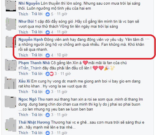Từ góc độ khác, nhiều người cho rằng, thông điệp "Đi rồi sẽ đến" của Trấn Thành như lời động viên và an ủi vợ giữa ồn ào vạ miệng. "Lửa thử vàng gian nan thử sức. Mình sẽ thất bại nếu như tự đánh mất chính mình. Chúc 2 bạn mãi là đôi bạn đồng hành của nhau" - Facebooker Dịu Candy bày tỏ.