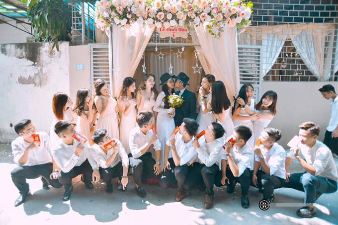 Cặp đôi hôn nhau trước dàn phù dâu, phù rể. |