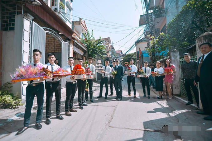 Hôm 14/10, nam diễn viên và dàn bạn bè bê tráp đã đến nhà cô dâu tại Thái Nguyên để hỏi cưới. |