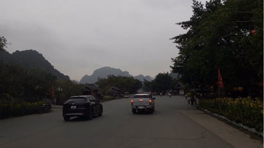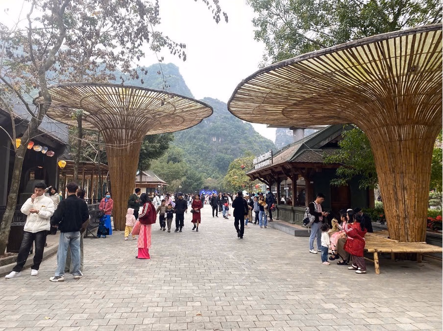 Tiết trời mùng 2 Tết mang đậm sắc xuân miền Bắc với những hạt mưa bụi lất phất và màn sương mỏng bao phủ các dãy núi đá vôi trùng điệp. Mặt đường còn ướt sau cơn mưa sớm nhưng không vì thế mà làm giảm đi sự háo hức của du khách.
