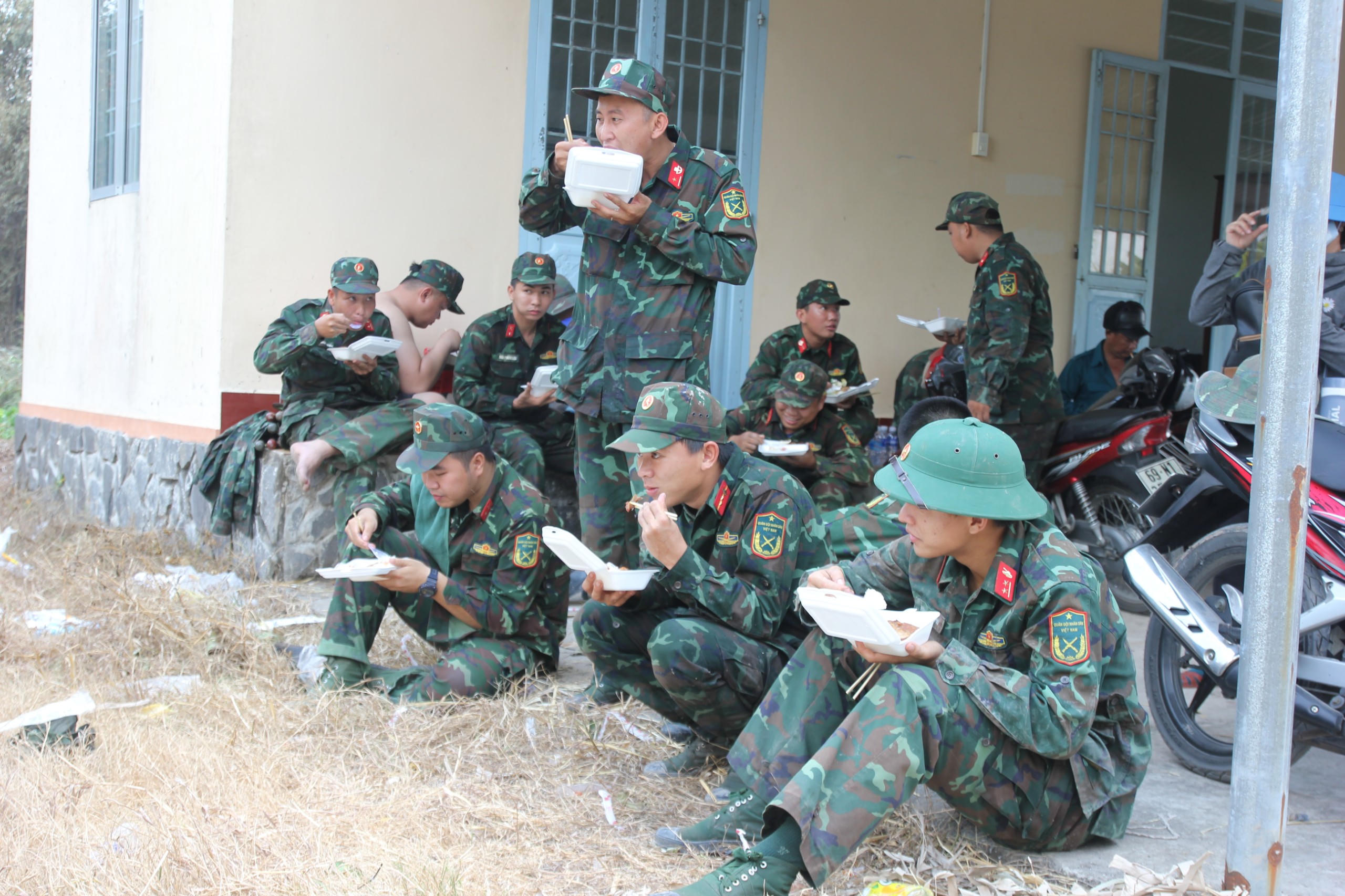 Các chiến sĩ tranh thủ ăn vội suất cơm được bà con quanh vùng và mạnh thường quân chuẩn bị. |