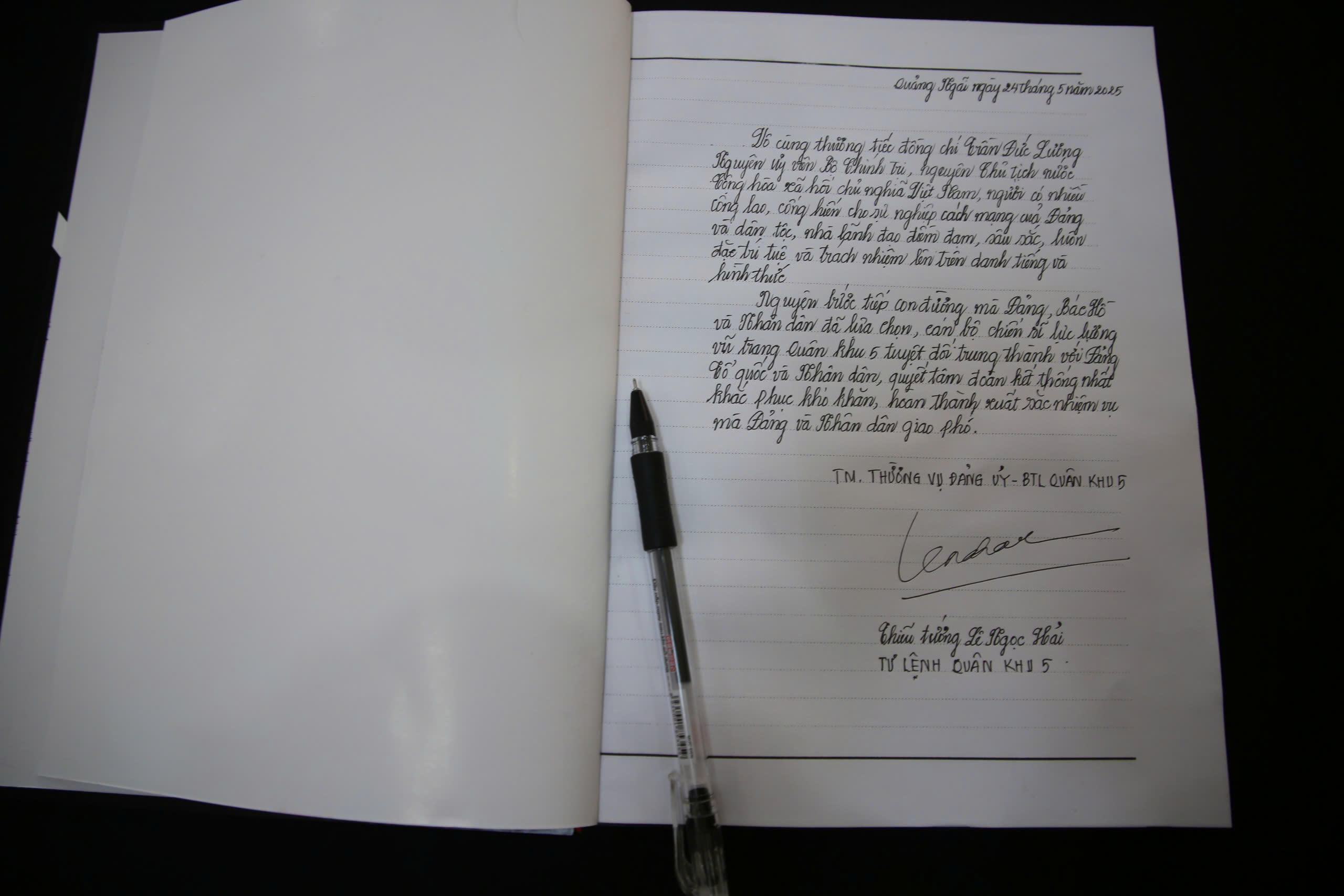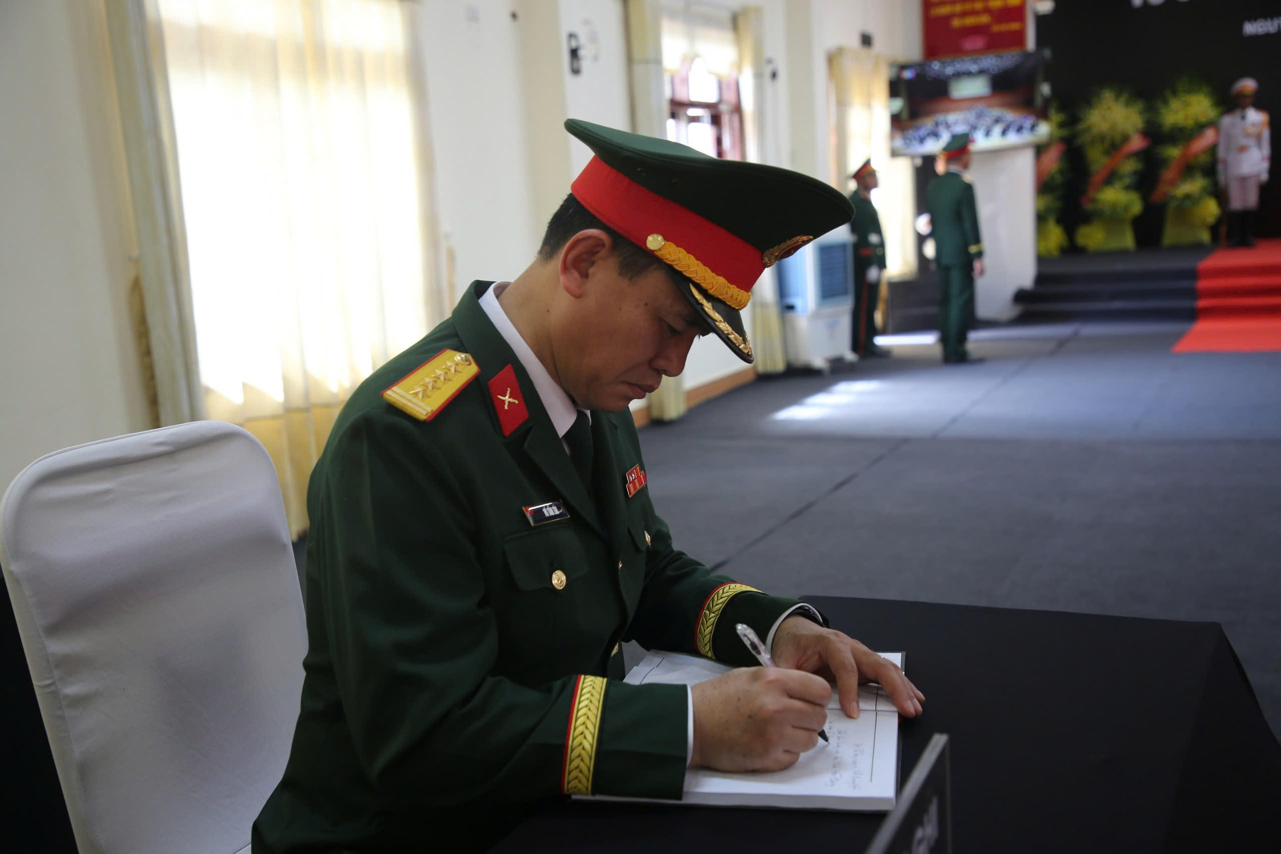 Thiếu tướng Lê Ngọc Hải, Tư lệnh Quân khu 5, viết vào sổ tang. |