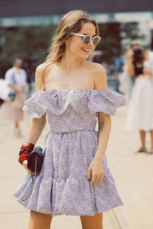 Nếu thuộc tuýp người ưa chuộng sự đơn giản, hãy chọn một chiếc váy hở vai với viền bèo nhỏ ở quanh vai.