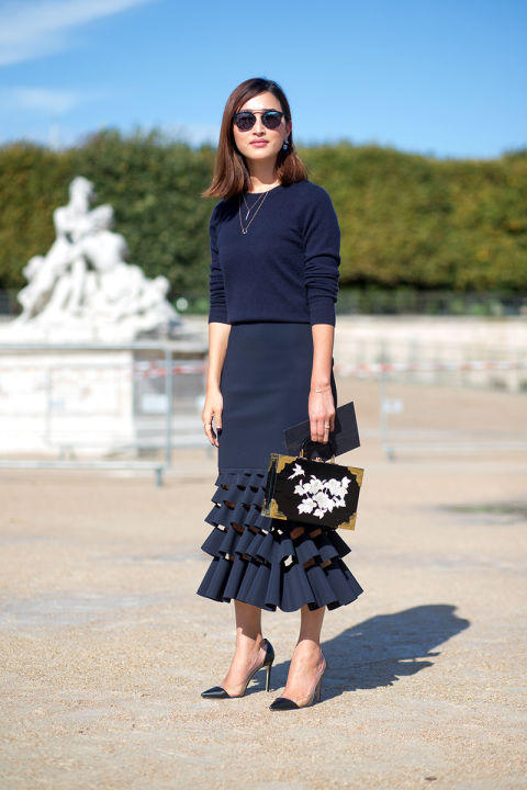 Chân váy với viền bèo có thể sẽ là lựa chọn khá “thách thức” với nhiều cô nàng. Song, đi cùng độ khó, nếu thành công bạn chắc chắn sẽ sở hữu vẻ ngoài thời trang tuyệt đối! Với chân váy ruffle, hãy thử công thức ruffle on ruffle. Với lựa chọn này, bởi vẻ cầu kỳ sẵn có, sẽ dễ đang hơn nếu trang phục bạn chọn là vải trơn không họa tiết.