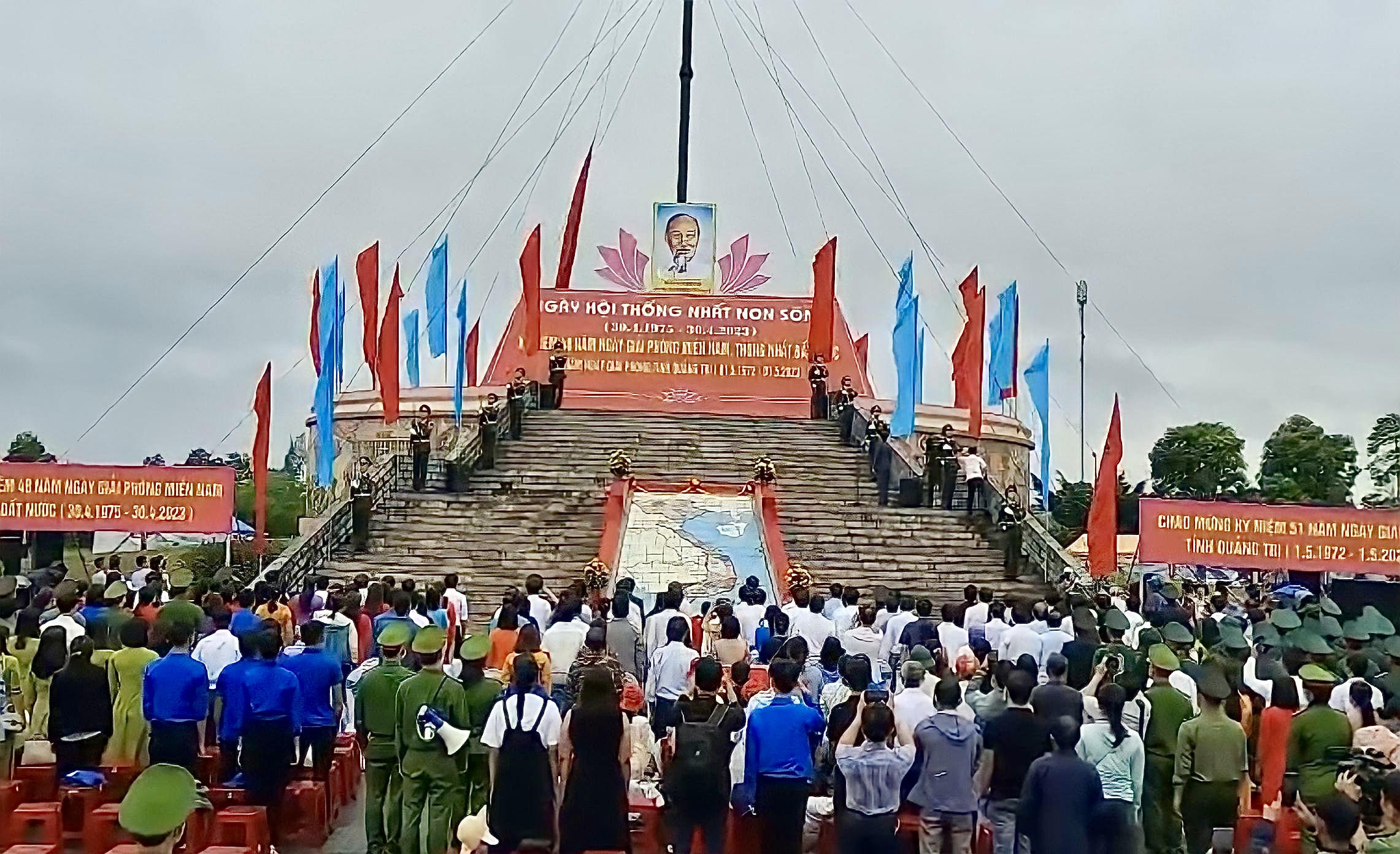 Trong khoảnh khắc thiêng liêng, trên nền nhạc Quốc ca hào hùng, lá cờ đỏ sao vàng được dần kéo lên trên kỳ đài Hiền Lương gợi nhớ về những năm tháng chiến tranh khốc liệt, cũng như là lời nhắc nhớ cho các thế hệ hôm nay và mai sau luôn biết trân quý giá trị của hòa bình, thống nhất.