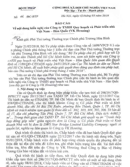 Trên cơ sở kết quả rà soát đối với vụ việc này, tại văn bản nêu trên, Bộ Tư pháp cho rằng “Đơn của Công ty VK Housing chuyển đến Bộ Tư pháp đều được bà Yeh Kuo, Shun - Kuai ký dưới chức danh Tổng Giám đốc, đại diện theo pháp luật của Công ty VK Housing. Tuy nhiên, hồ sơ thể hiện ngày 29/9/2017 Phòng Đăng ký kinh doanh - Sở Kế hoạch và Đầu tư Tp. Hồ Chí Minh đã có Quyết định số 790103/17 về việc thu hồi Giấy chứng nhận đăng ký doanh nghiệp, nội dung: Hủy bỏ đăng ký thay đổi lần thứ 02 của VK Housing do bà Yeh Kuo, Shun - Kuai làm đại diện theo pháp luật vì Giấy chứng nhận đăng ký doanh nghiệp này được cấp trên cơ sở các thông tin giả mạo của doanh nghiệp; khôi phục giá trị pháp lý của Giấy chứng nhận đầu tư số 411022000109 được cấp lần thứ 01 do Jong-Suk, Le là người đại diện theo pháp luật. Do đó, tại thời điểm ký đơn nêu trên, bà Yeh Kuo, Shun - Kuai không còn là đại diện theo pháp luật của VK Housing, không có tư cách đại diện cho doanh nghiệp theo quy định tại Điều 13 Luật Doanh nghiệp năm 2014 nên không có sơ sở giải quyết khiếu nại theo quy định”.