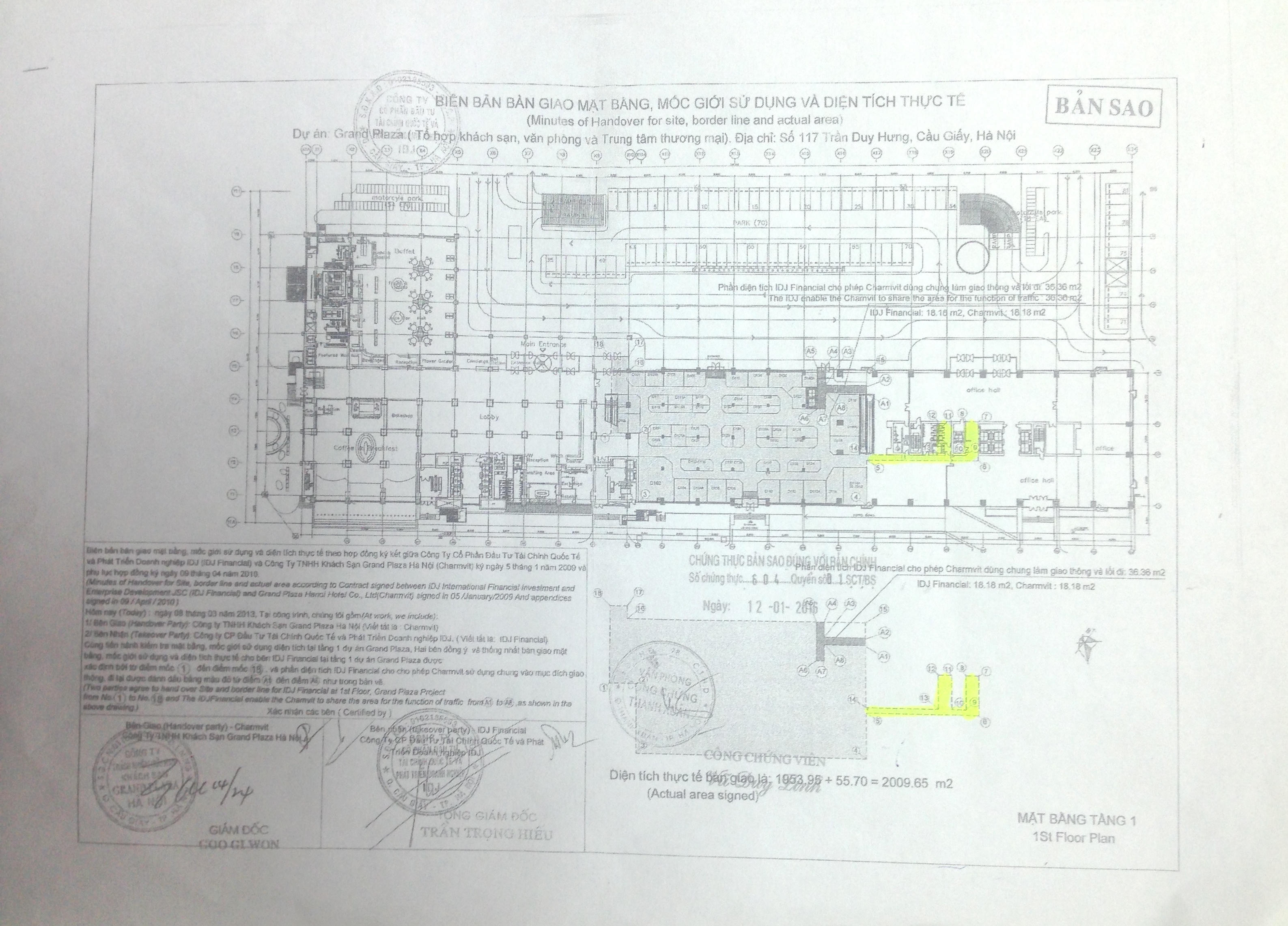 Nói về nguồn cơn của sự việc này, ông Nguyễn Đức Quân cho biết, sau khi ký hợp đồng với Grand Plaza, IDJ đã tiến hành nộp thuế đất và thanh toán đầy đủ số tiền hơn 41 triệu USD cho toàn bộ quãng thời gian 50 năm. “Sau khi ký kết hợp đồng, trung tâm thương mại đi vào hoạt động nhưng đến năm 2012 chúng tôi phải đóng cửa vì gặp khó khăn do tình hình bất động sản đóng băng, chi phí hoạt động tăng cao. Đến năm 2016, chúng tôi bằng nỗ lực đã khôi phục và đưa trung tâm thương mại hoạt động trở lại. Cũng từ đó, Charmvit nảy sinh ý định chiếm khu đất 103m2 tại tầng 1 từ điểm mốc 05 đến điểm mốc 14 trên bảng hiện trạng ký ngày 8/3/2013 giữa đại diện 2 bên” – ông Nguyễn Đức Quân khẳng định.