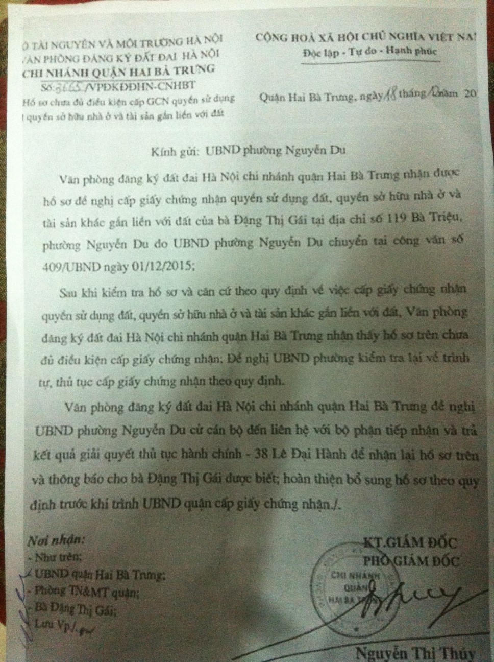 Liên quan đến việc cấp GCN quyền sử dụng đất, quyền sở hữu nhà ở và tài sản gắn liền với đất tại 119 Bà Triệu, ngày 18/12/2015, Văn phòng Đăng ký đất đai Hà Nội, chi nhánh quận Hai Bà Trưng có văn bản số 3665 nêu rõ: Sau khi kiểm tra hồ sơ và căn cứ theo quy định pháp luật về việc cấp giấy chứng nhận quyền sử dụng đất, quyền sở hữu nhà ở và tài sản khác gắn liền với đất, văn phòng đăng ký đất đai Hà Nội chi nhánh quận Hai Bà Trưng nhận thấy hồ sơ trên chưa đủ điều kiện cấp giấy chứng nhận.