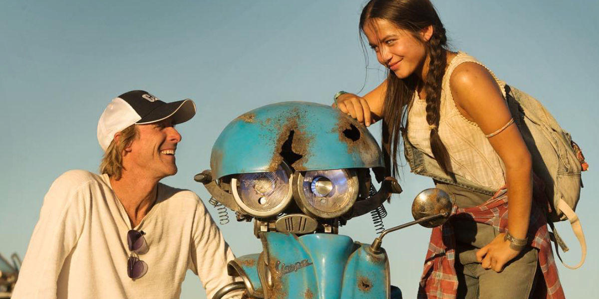 | Michael Bay bên cạnh nữ diễn viên trẻ 15 tuổi Isabela Moner và cậu robot dễ thương mang hình dáng chiếc vespa màu xanh |