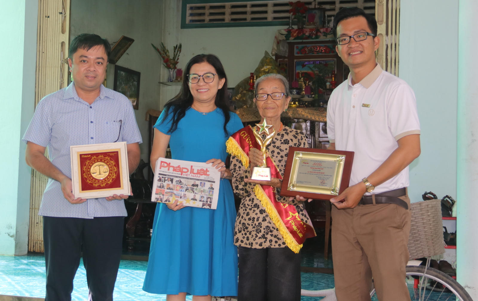 Đại diện Sở Tư pháp, Phòng Tư pháp và Báo PLVN tại ĐBSCL chụp hình với bà Nguyễn Kim Huê |