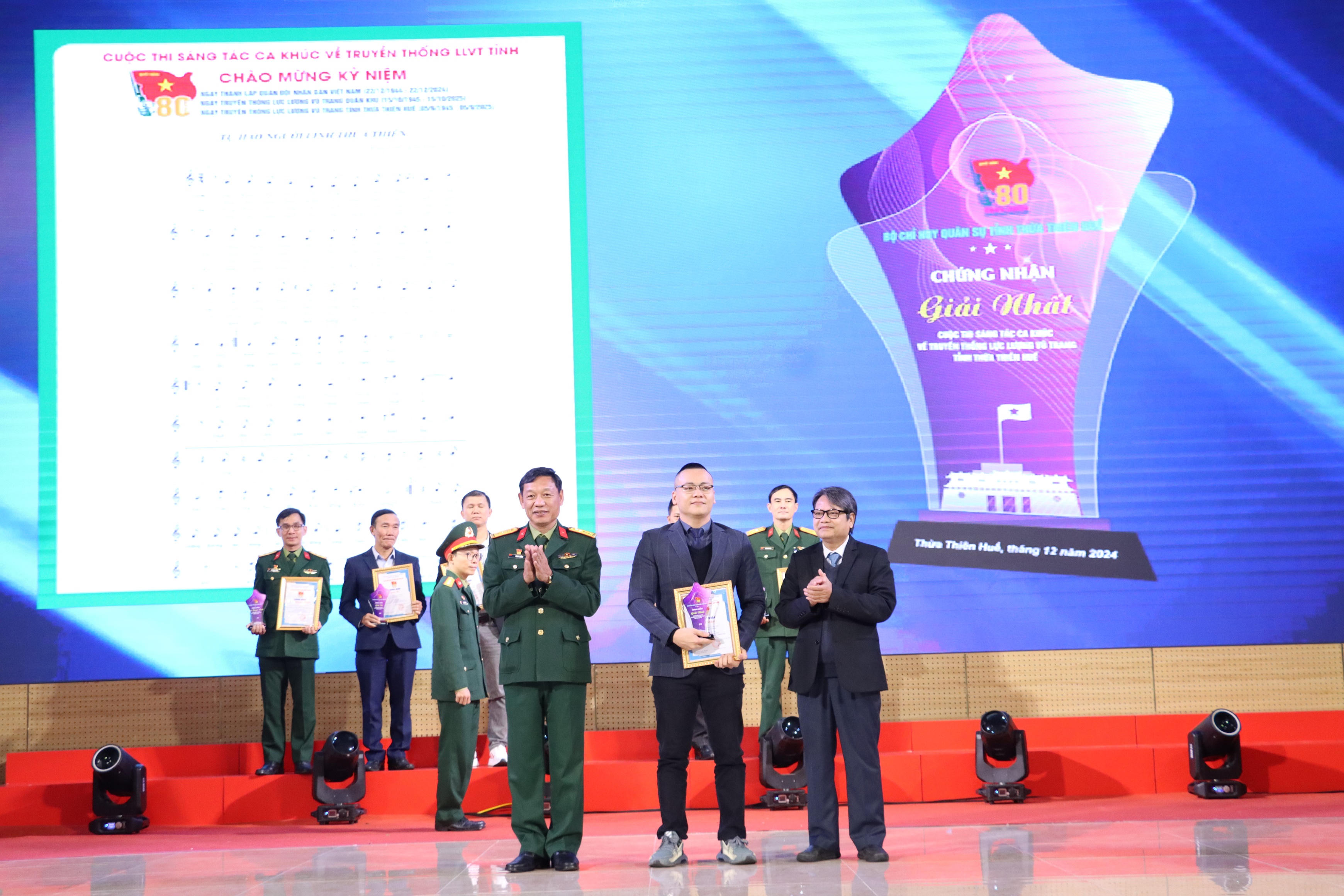Lãnh đạo Bộ CHQS tỉnh Thừa Thiên Huế và thành viên Ban Tổ chức trao giải cho tác giả đạt giải Nhất cuộc thi ca khúc về truyền thống. |