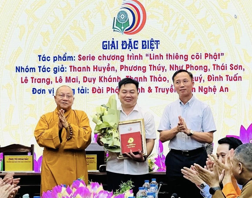 Hòa thượng Thích Gia Quang - Trưởng Ban Tổ chức, và ông Vũ Hoài Bắc - Trưởng Ban Tôn giáo Chính phủ trao giải Đặc biệt cho đại diện nhóm tác giả Đài Truyền hình Nghệ An (Ảnh: Thùy Dương). |