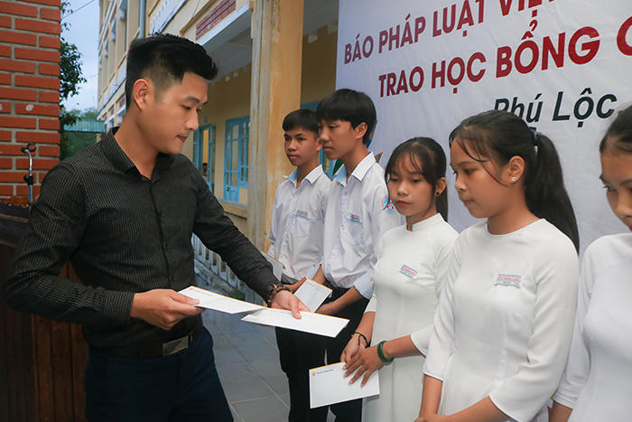 Theo đó, Văn phòng Báo Pháp luật Việt Nam khu vực Bình Trị Thiên và Công ty Hoàng Thịnh Phát Land đã trao 30 suất học bổng cho các em học sinh trường THPT Thừa Lưu, mỗi suất có trị giá tiền mặt là 1 triệu đồng.
