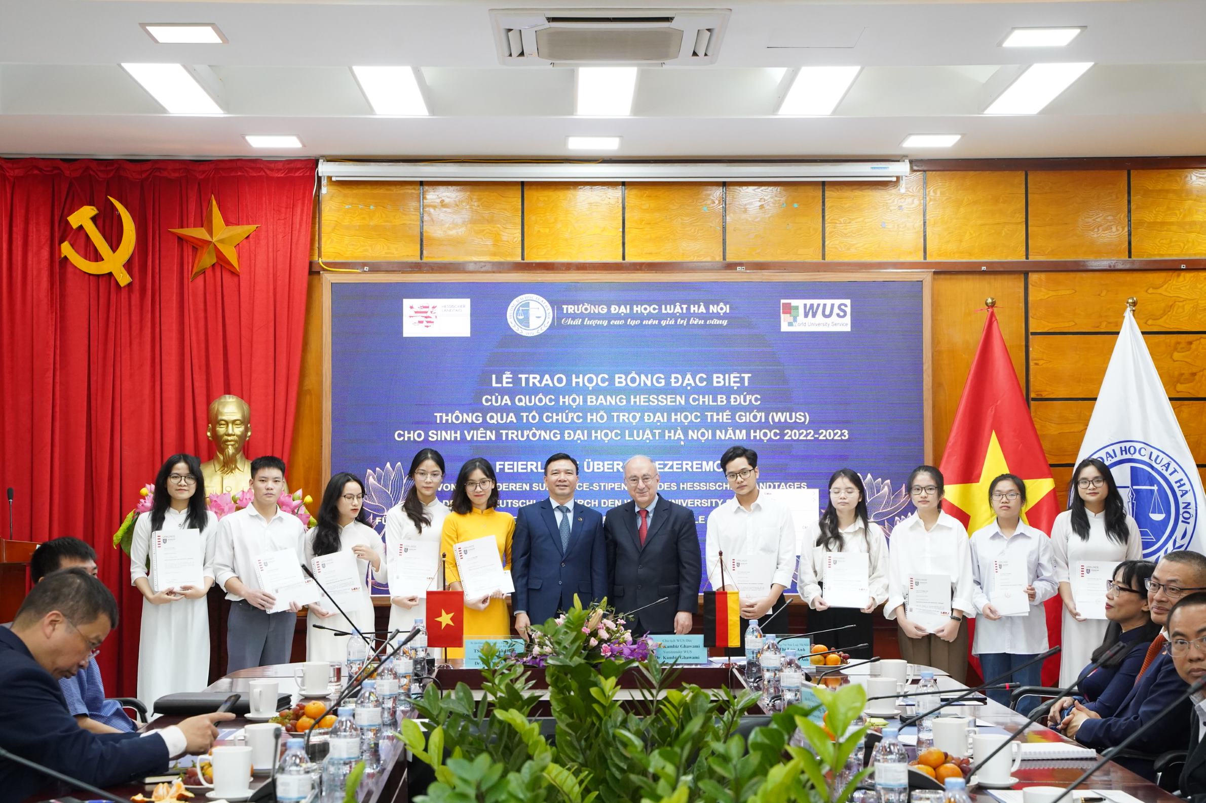 (PLVN) -Sáng 14/11, Trường Đại học Luật Hà Nội đã tổ chức Lễ trao học bổng đặc biệt của Quốc hội Bang Hessen Cộng hoà Liên bang Đức thông qua tổ chức hỗ trợ Đại học Thế giới (WUS) cho sinh viên Trường Đại học Luật Hà Nội năm 2022 – 2023.