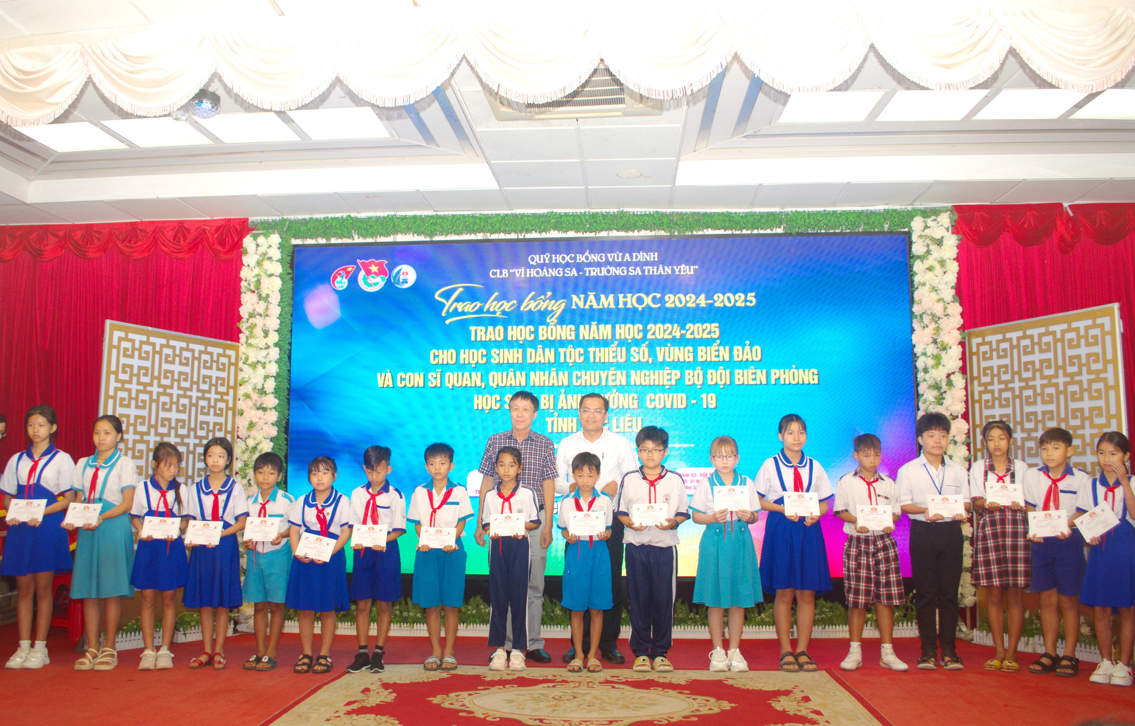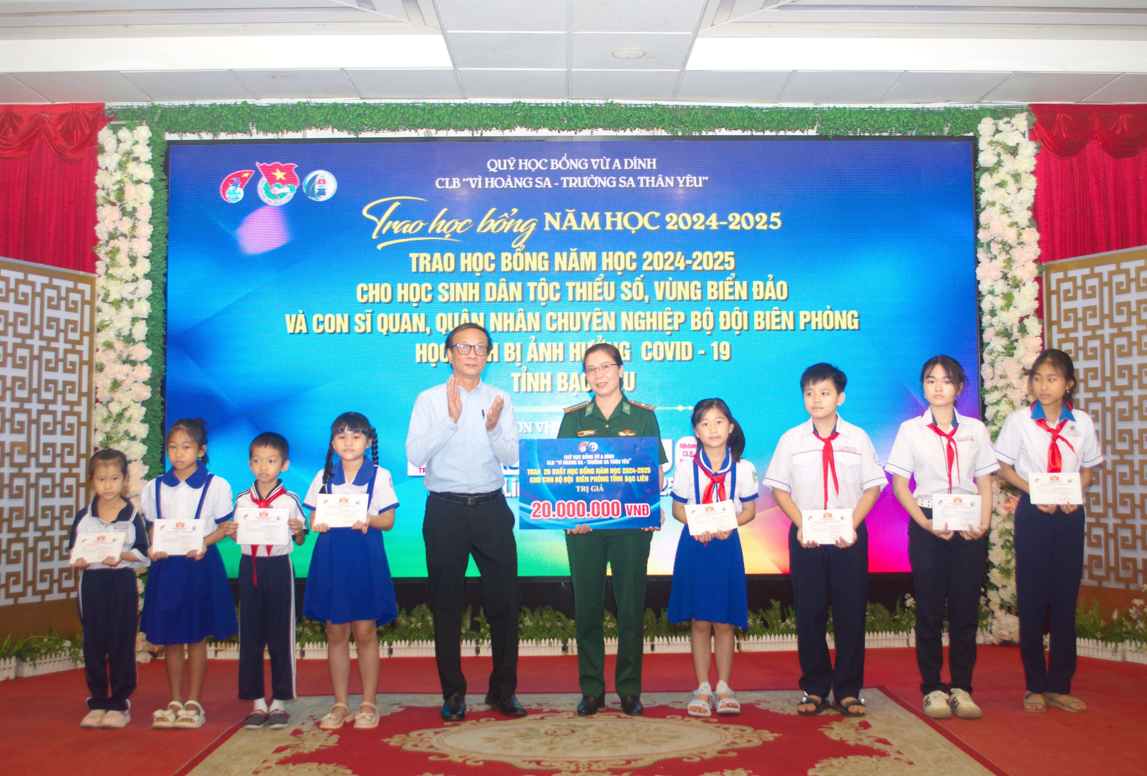 Tại buổi lễ, Quỹ học bổng Vừ A Dính đã trao 35 suất học bổng cho các em học sinh dân tộc thiểu số có hoàn cảnh khó khăn trên địa bàn tỉnh Bạc Liêu (mỗi suất trị giá 1 triệu đồng). CLB “Vì Hoàng Sa - Trường Sa thân yêu” trao 35 suất học bổng cho các em học sinh là con của gia đình ngư dân có hoàn cảnh khó khăn trên địa bàn tỉnh (mỗi suất trị giá 1 triệu đồng). Đồng thời, trao bảng tượng trưng 20 suất học bổng cho con em chiến sĩ, quân nhân chuyên nghiệp Bộ đội Biên phòng tỉnh Bạc Liêu.