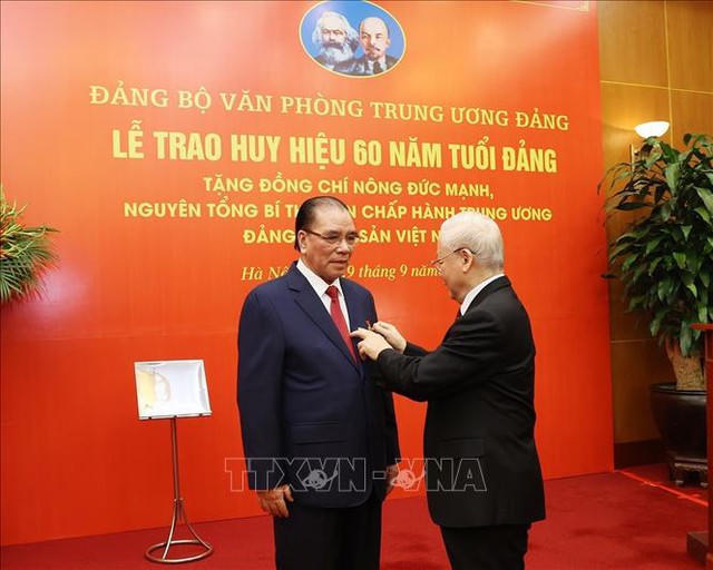 Tổng Bí thư Nguyễn Phú Trọng đã dự và trao Huy hiệu 60 năm tuổi Đảng tặng nguyên Tổng Bí thư Nông Đức Mạnh.