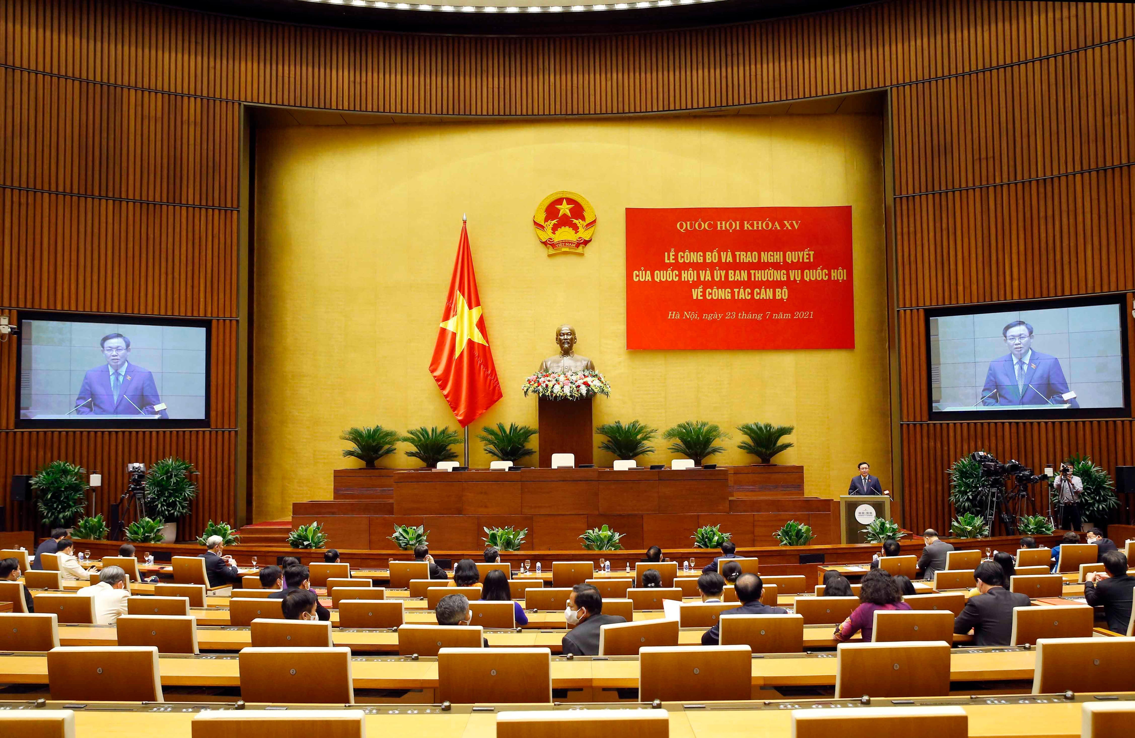 (PLVN) - Chiều 23/7, tại Nhà Quốc hội, Ủy viên Bộ Chính trị, Chủ tịch Quốc hội Vương Đình Huệ đã dự Lễ công bố và trao Nghị quyết của Quốc hội, Ủy ban Thường vụ Quốc hội về công tác cán bộ.