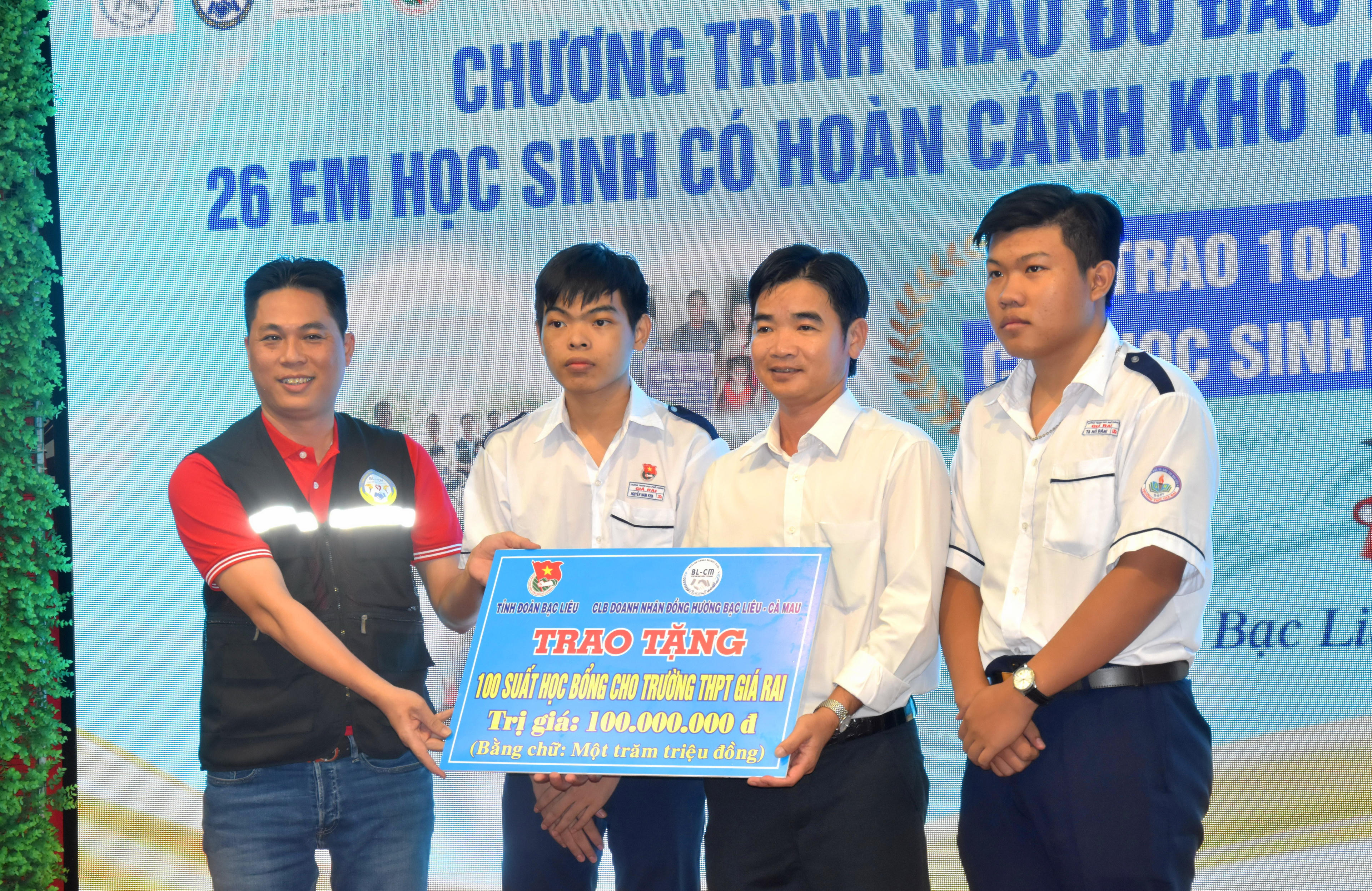 Trong khuôn khổ chương trình với chủ đề “Tình đất tình người Bạc Liêu”, Tỉnh đoàn Bạc Liêu đã phối hợp với Câu lạc bộ Doanh nhân đồng hương Bạc Liêu - Cà Mau tại TP. Hồ Chí Minh trao đỡ đầu hỗ trợ, giúp đỡ cho 26 học sinh có hoàn cảnh khó khăn, mồ côi do COVID-19 (cấp tiểu học 05 triệu đồng/ em/ năm, THCS 06 triệu đồng/ em/ năm, cấp THPT 07 triệu đồng/em/ năm) và trao 100 suất học bổng (1 triệu đồng/ suất) cho học sinh nghèo Trường THPT Giá Rai, thị xã Giá Rai, tỉnh Bạc Liêu) với tổng trị giá 246 triệu đồng.