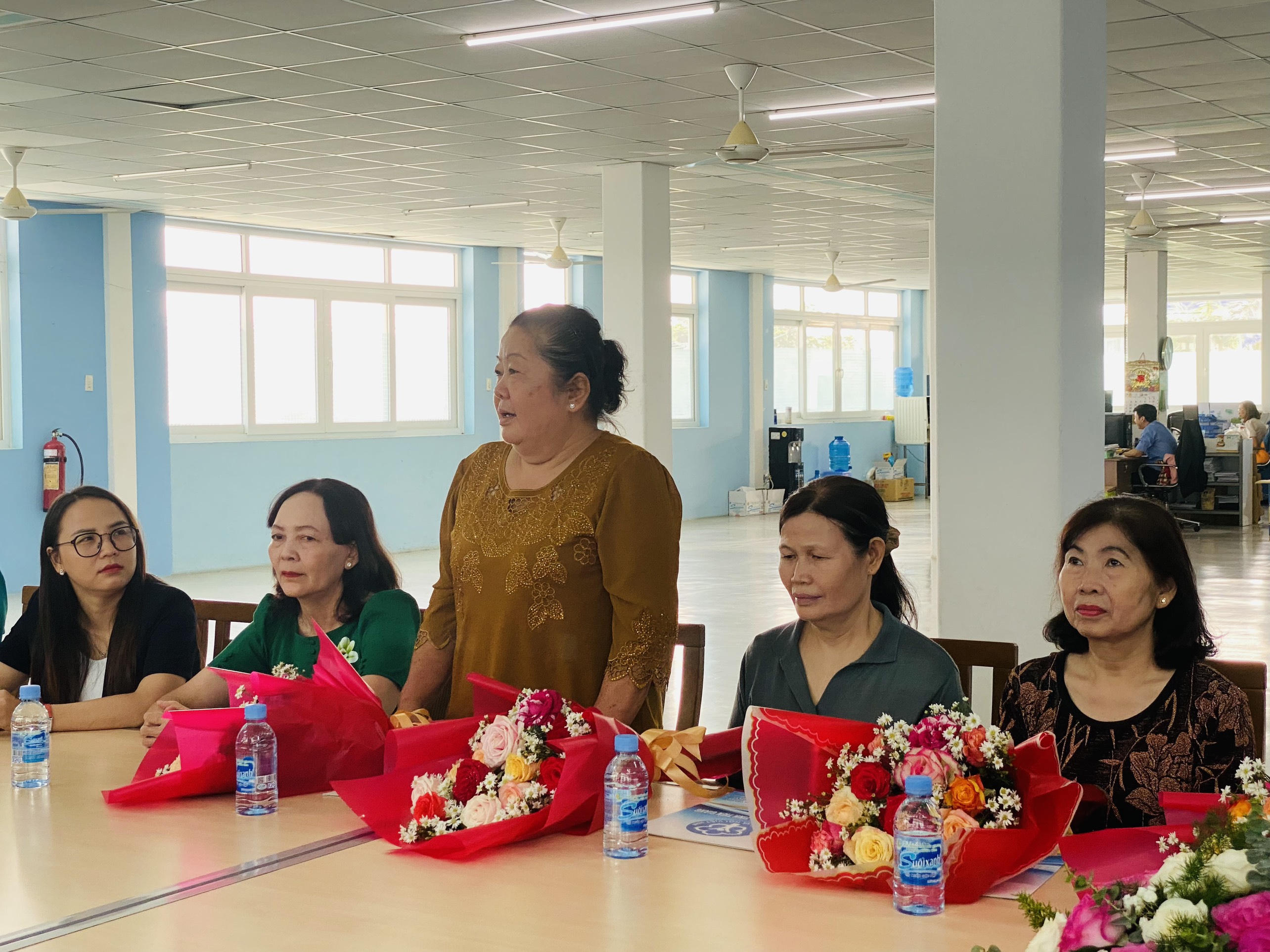 Bà Lê Thẩm Trang xúc động chia sẻ niềm vui với đại diện BHXH tỉnh Tiền Giang và lãnh đạo công ty. Ảnh: Thiện Lê |