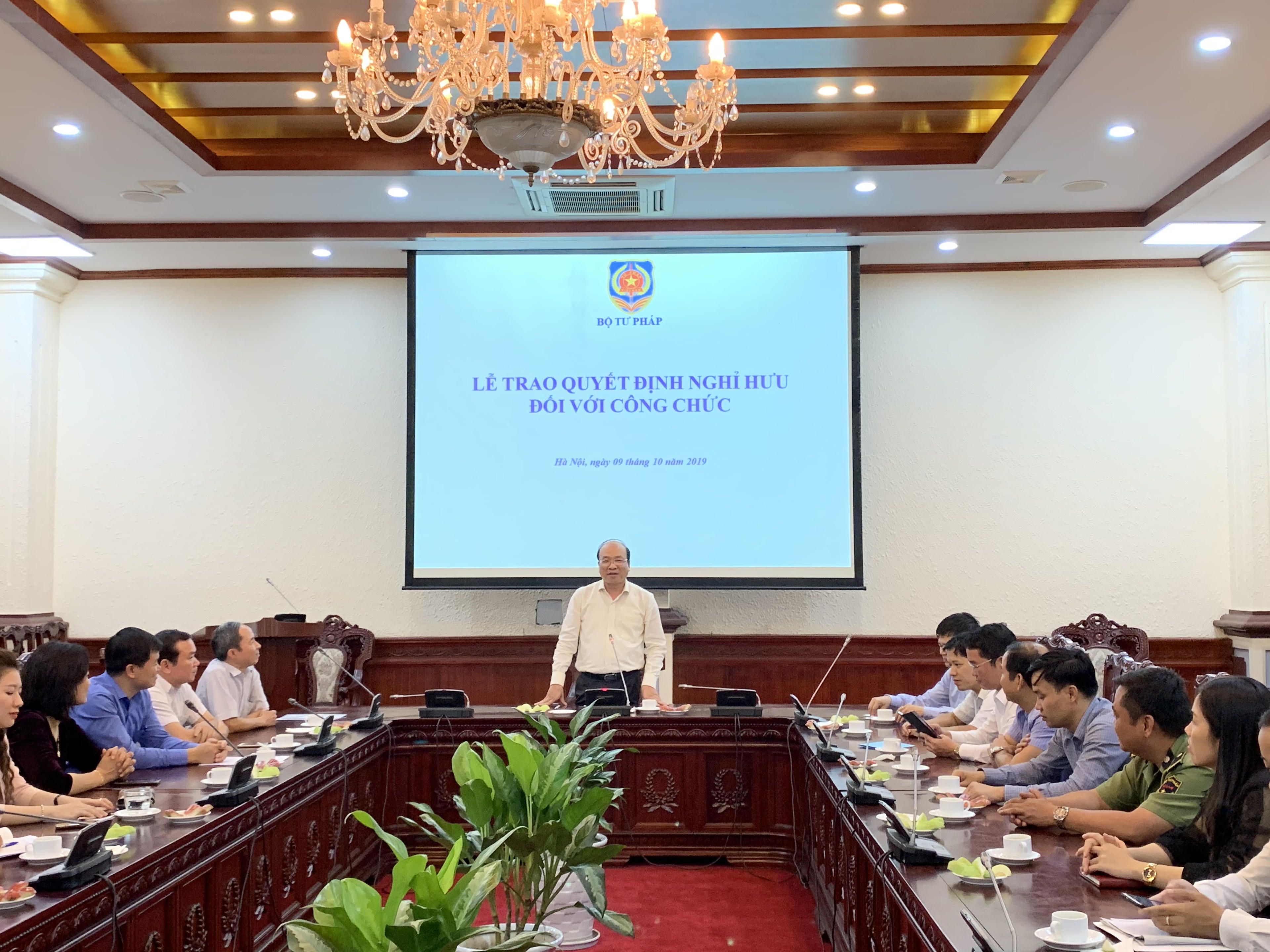 Bên cạnh đó, ông trân trọng cảm ơn những đánh giá tích cực, những tình cảm của Lãnh đạo Bộ, lãnh đạo các đơn vị và anh em đồng nghiệp về quá trình công tác của ông và gửi gắm đội ngũ cán bộ kế cận tiếp tục phát huy truyền thống đoàn kết để hoàn thành xuất sắc nhiệm vụ được giao, đáp ứng những yêu cầu, nhiệm vụ chính trị của Đảng, Nhà nước nói chung và của Bộ Tư pháp nói riêng.