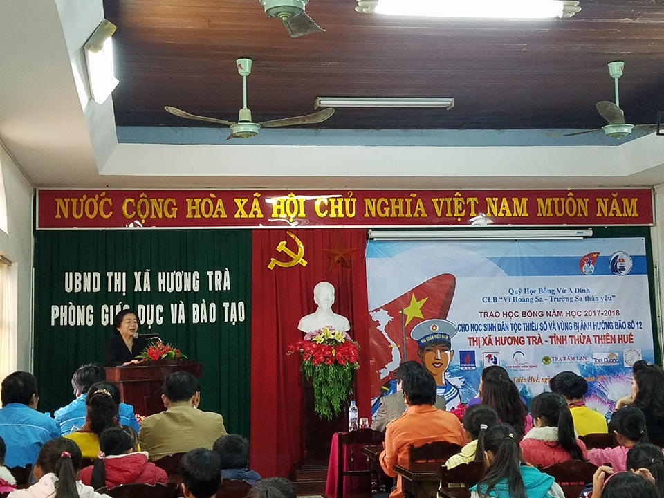 Được biết, từ ngày 26/11 - 29/11/2017, Ban Chủ nhiệm CLB " Vì Hoàng Sa - Trường Sa thân yêu" đi trao học bổng cho học sinh vùng bão lũ miền Trung dọc các tỉnh Khánh Hòa, Phú yên, Bình Định, Quảng Ngãi, Quảng Nam, Thừa Thiên Huế và con cán bộ chiến sĩ Vùng 4 Hải quân, Lữ đoàn tàu ngầm 189 và Bộ đội Biên phòng huyện đảo Lý Sơn với tổng cộng 830 suất học của CLB và 350 suất Học bổng Vừ A Dính.
