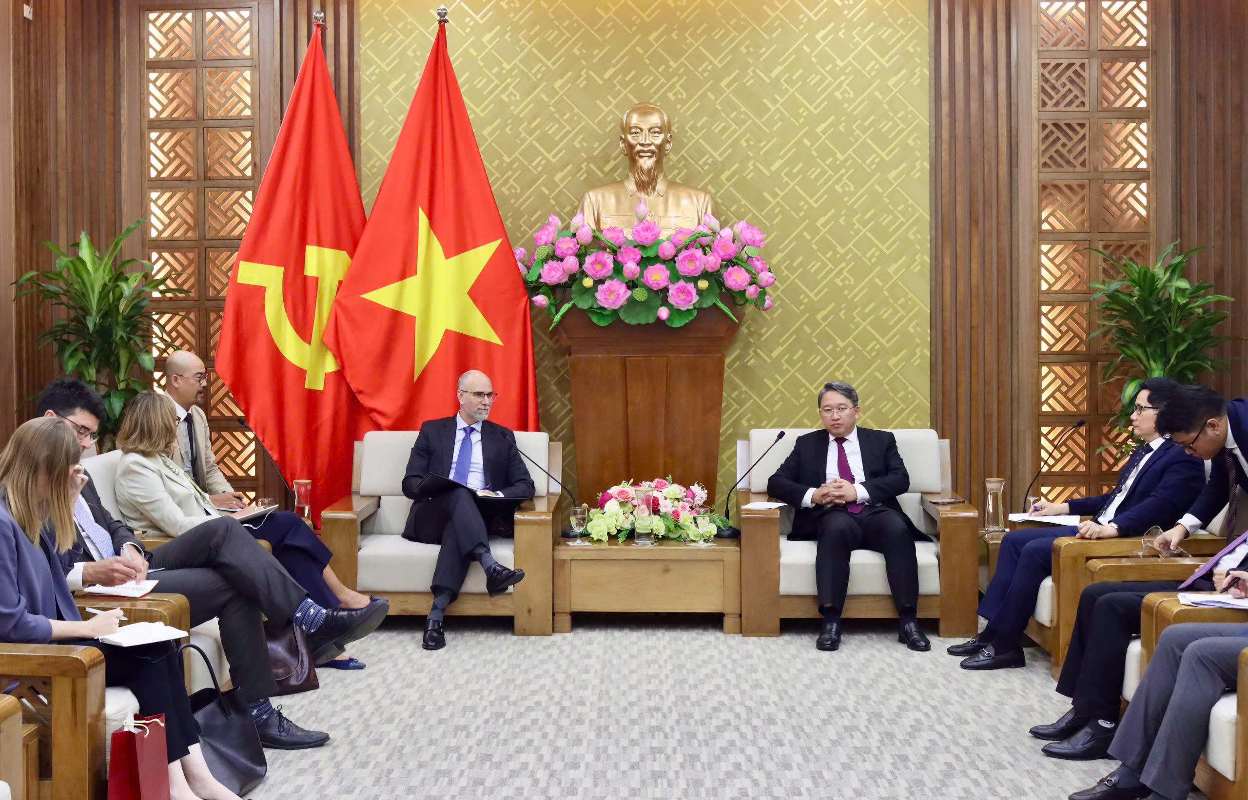 Bộ trưởng Nguyễn Hải Ninh chụp ảnh lưu niệm cùng đoàn công tác của Đại sứ đặc mệnh toàn quyền Canada tại Việt Nam. |