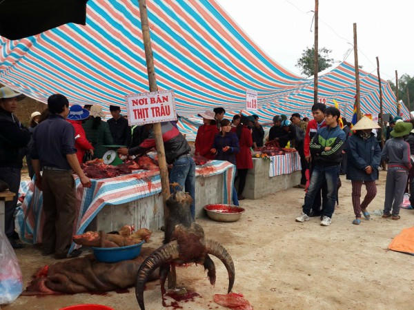 Những con trâu vừa bị thua cuộc và loại khỏi vòng đấu lập tức được đưa ra quầy giết mổ ngay cạnh sân vận động. Thịt, đầu, nội tạng, tiết..được chủ trâu mang ra bán ở Hội chợ thịt trâu Chọi cho khách đến mua.