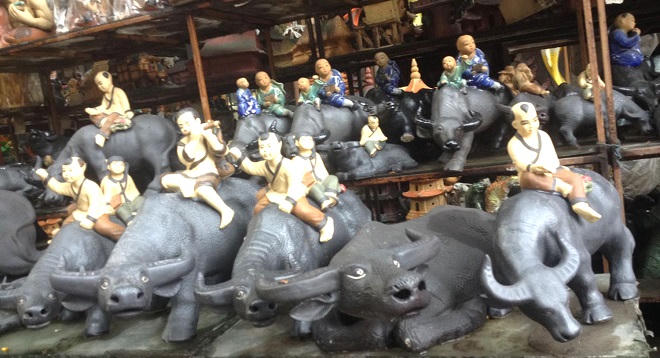 Chính vì vậy, năm Tân Sửu, các nghệ nhân làng gốm Bát Tràng đặc biệt kỳ công tạo nên những chú trâu ngộ nghĩnh. Tượng trâu vàng được thể hiện khá đa dạng dưới nhiều tư thế và ở nhiều bộ môn khác nhau như cầu lông, bóng đá, bóng bàn, chú bé thổi sáo trên lưng trâu...