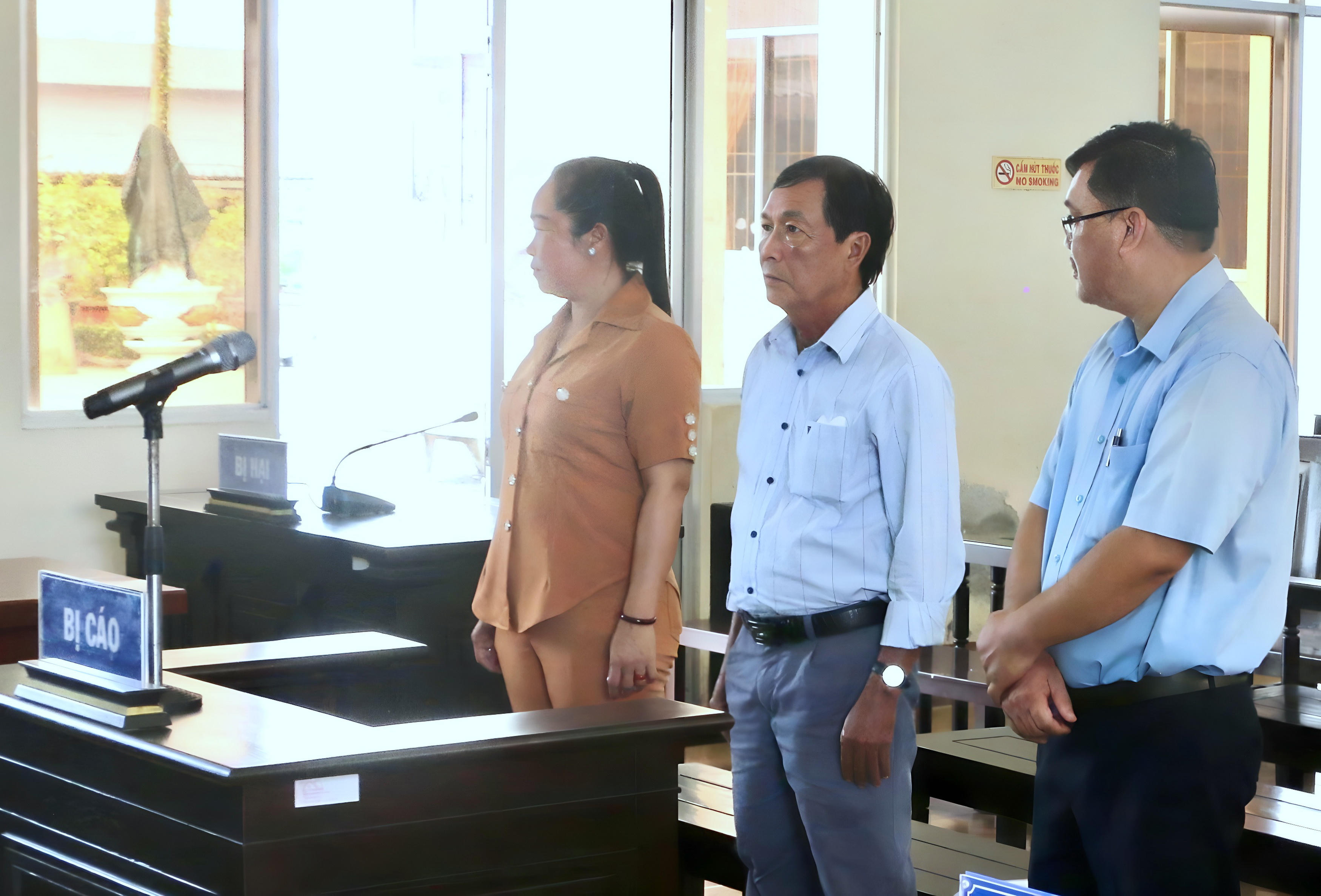 Các bị cáo Châu Hoàng Đỉnh, Nguyễn Văn Thăm - cựu Phó Giám đốc Sở Xây dựng tỉnh Bạc Liêu (đứng giữa) cùng Hứa Thị Hằng Mơ tại phiên tòa. |