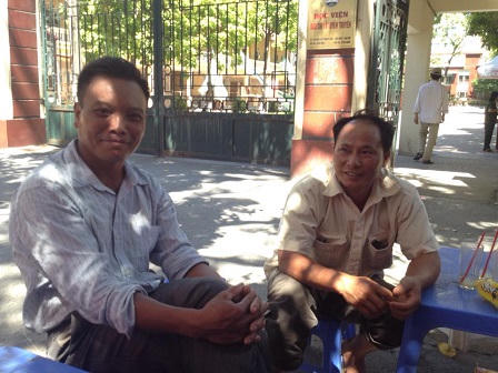Một vị phụ huynh ngồi tránh nắng để chờ con mình làm xong thủ tục thi.