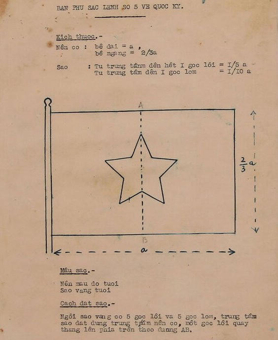 Theo Bản phụ Sắc lệnh ấn định Quốc kỳ Việt Nam có kích thước: Nền cờ: Bề dài = a, bề ngang = 2/3a. Sao: Từ trung tâm đến hết I góc lồi = 1/5a, từ trung tâm đến I góc lõm = 1/10a. Mầu sắc: Nền mầu đỏ tươi, Sao vàng tươi.