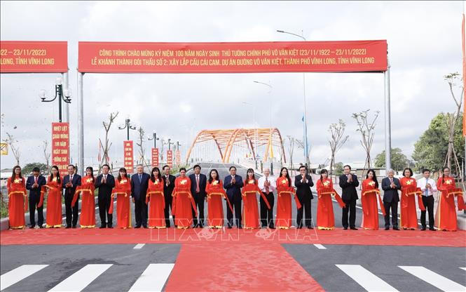 Trước khi dự Lễ kỷ niệm, Thủ tướng Chính phủ Phạm Minh Chính và các đại biểu dự Lễ đã thực hiện nghi thức khánh thành, đưa vào sử dụng cầu Cái Cam thuộc dự dán xây dựng đường Võ Văn Kiệt, thành phố Vĩnh Long - công trình chào kỷ niệm 100 năm Ngày sinh Thủ tướng Chính phủ Võ Văn Kiệt (23/11/1922-23/11/2022).