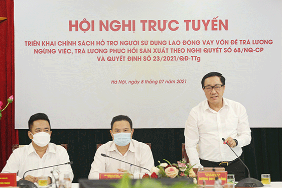(PLVN) - Chiều ngày 8/7 , Ngân hàng Chính sách xã hội (NHCSXH) tổ chức Hội nghị trực tuyến toàn quốc triển khai nghiệp vụ cho vay người sử dụng lao động để trả lương ngừng việc, trả lương phục hồi sản xuất theo Nghị quyết số 68/NQ-CP ngày 1/7/ 2021 và Quyết định số 23/2021/QĐ-TTg ngày 07/7/2021 của Chính phủ về một số chính sách hỗ trợ NLĐ và NSDLĐ gặp khó khăn do đại dịch COVID-19 .