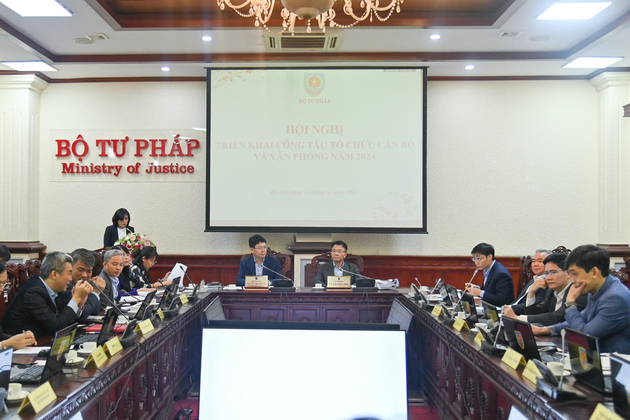 (PLVN) -Chiều 11/1, Bộ Tư pháp đã tổ chức Hội nghị triển khai công tác tổ chức cán bộ và văn phòng năm 2024 do Bộ trưởng Lê Thành Long chủ trì. Cùng dự có Thứ trưởng Nguyễn Thanh Tịnh; Phó Bí thư thường trực Đảng uỷ Nguyễn Kim Tinh.