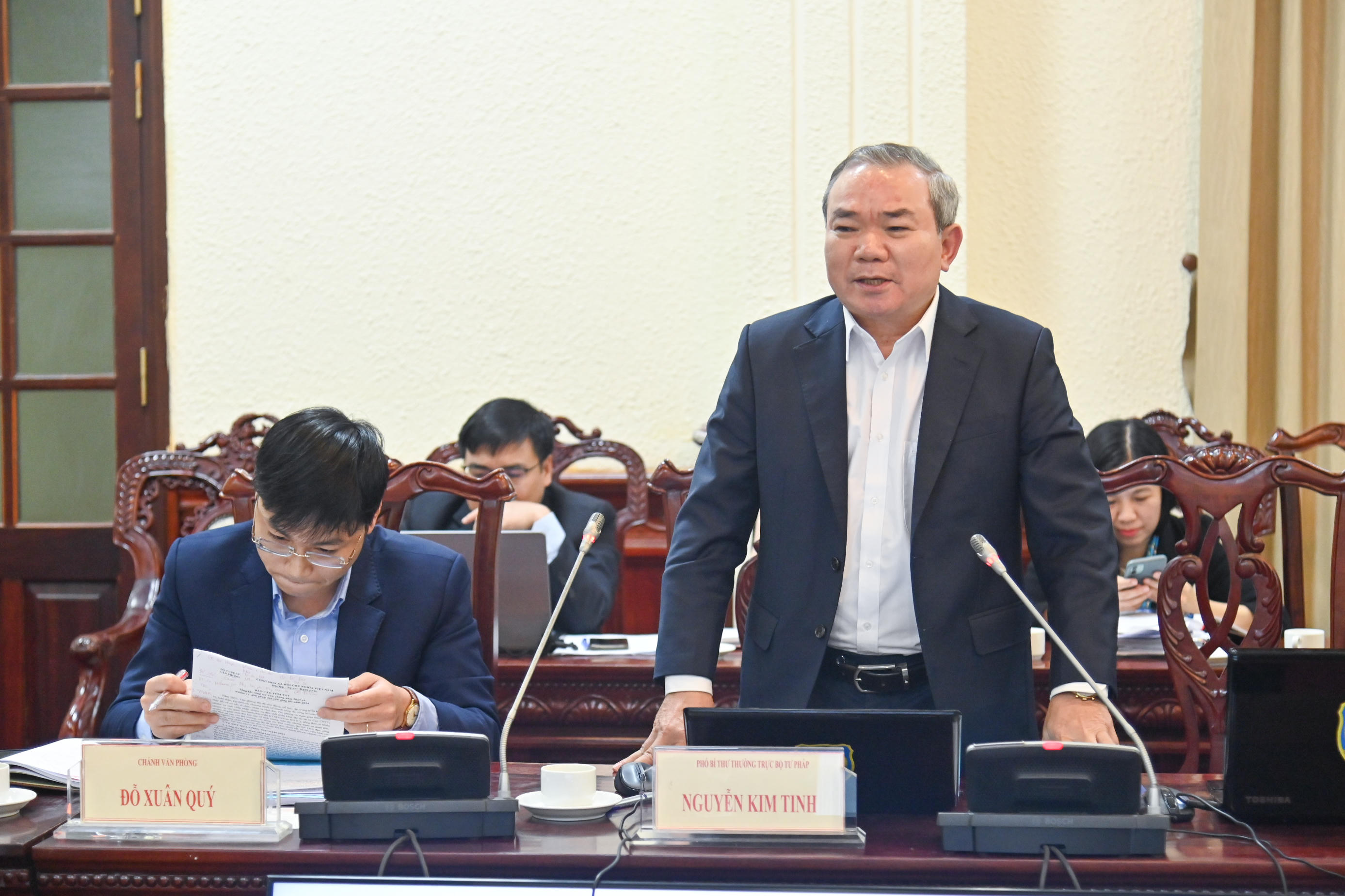 Đối với Văn phòng Bộ, Thứ trưởng đề nghị cần quan tâm hơn đến công tác văn thư lưu trữ, bảo vệ bí mật nhà nước gắn với đảm bảo an toàn an ninh mạng; phối hợp với Cục Công nghệ thông tin và Cục Kế hoạch – Tài chính tăng cường ứng dụng công nghệ thông tin trong công tác chuyên môn. Thứ trưởng cũng nhấn mạnh, Đề án 06 được coi là một trong những trụ cột của cải cách hành chính, xây dựng Chính phủ điện tử; vì vậy, Văn phòng Bộ cần quan tâm hơn nữa đến việc triển khai thực hiện Đề án 06 của Bộ Tư pháp. Ngoài ra, Thứ trưởng đề nghị Văn phòng Bộ tăng cường truyền thông về hoạt động, lĩnh vực công tác nổi bật của Bộ, ngành trên các phương tiện thông tin đại chúng; góp phần nâng cao nhận thức và hiểu biết về pháp luật của người dân.