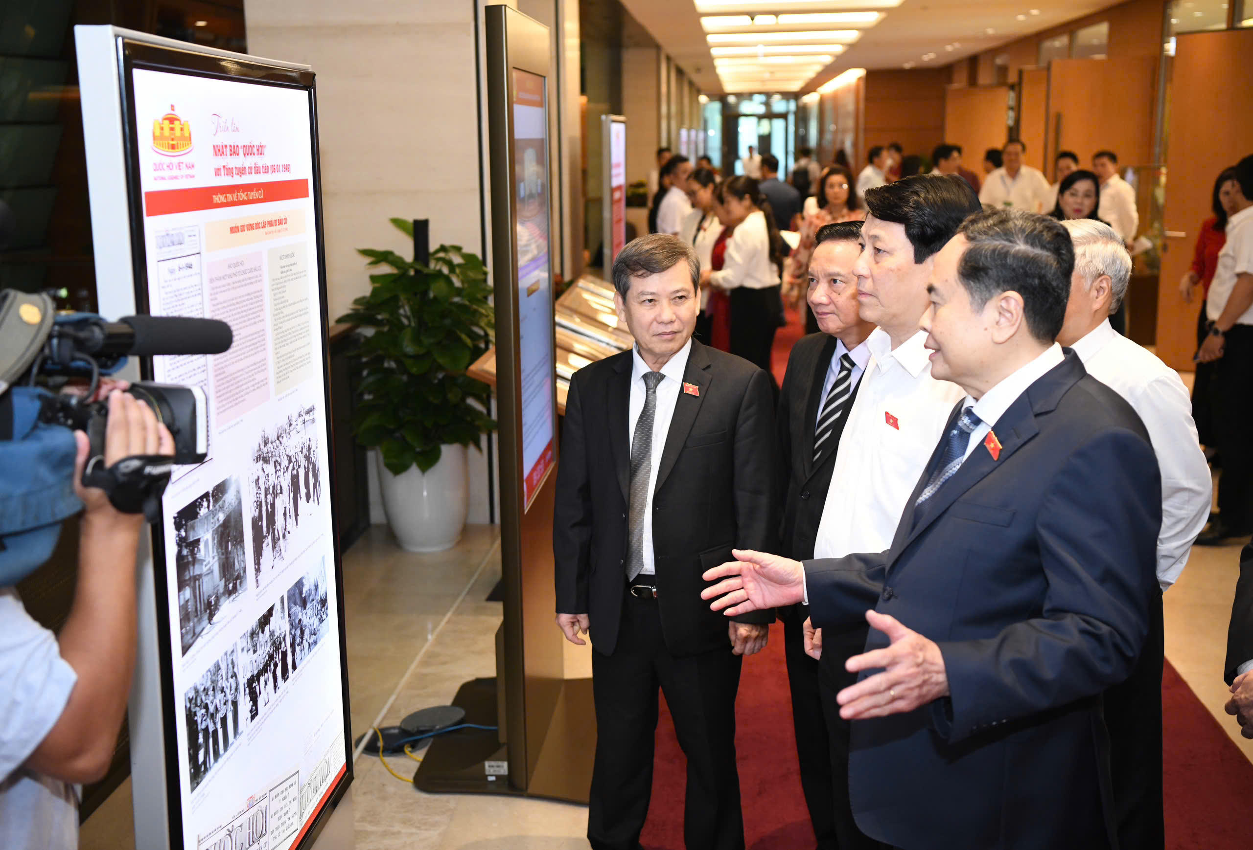 (PLVN) - Sáng 23/10, tại Nhà Quốc hội, Chủ tịch nước Lương Cường, Chủ tịch Quốc hội Trần Thanh Mẫn cùng các lãnh đạo Quốc hội, đại biểu Quốc hội tham quan Triển lãm chuyên đề “Nhật báo Quốc hội với Tổng tuyển cử đầu tiên (6/1/1946)”.