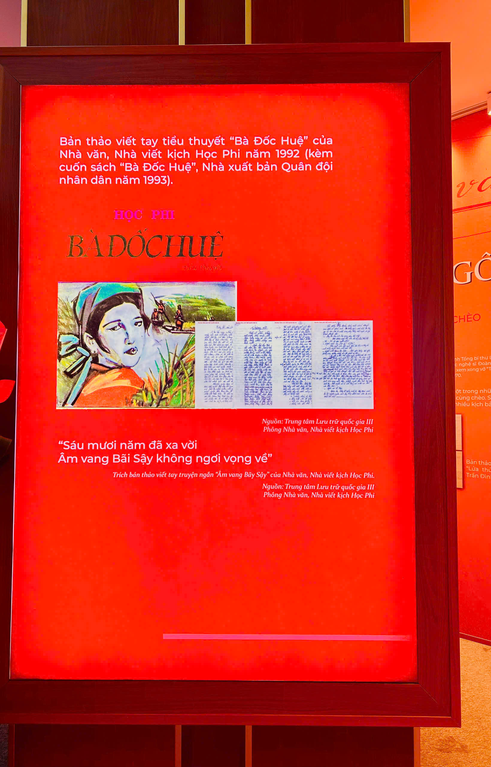 Hình ảnh, tài liệu lưu trữ về nhà văn - nhà viết kịch Học Phi tại triển lãm. (ảnh T.D) |